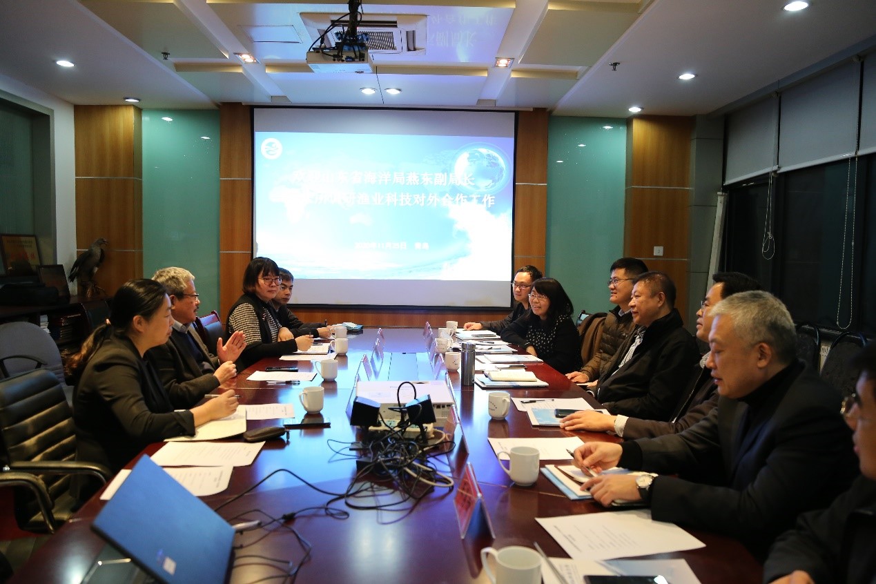 11月25日,山东省海洋局副局长燕东在青岛市海洋发展局副局长孙云潭等陪同下到中国水产科学研究院黄海水产研究所调研对外合作工作?;坪K芯克彼だ罱〖跋喙厝嗽苯哟搜喽本殖ひ恍校⒔辛俗附涣?。