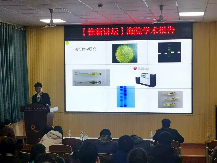 此次学术交流包括国家基金申报专题报告和学术报告两个部分。在国家基金申报专题报告会上,邵长伟研究员结合个人切身体会,针对国家自然科学基金申请和评审,分别以申请人、评审人角度,从选题、摘要、方法、技术路线、研究基础等视角切入,向学院各级领导以及拟申报国家基金的年轻教师就申请书撰写过程中需注意的问题做了全面详细的介绍。在学术报告会上,董宣副研究员向海洋学院教师及研究生做了题为“水生动物流行病学与生物安?!钡难醣ǜ?,结合党的十九届五中全会精神和习近平同志关于海洋强国的重要讲话精神,向与会师生分享了坚持海洋科技和生物工程领域的创新在我国现代化建设中的作用;结合在水生动物流行病学和生物安保方面的工作分享了他的科研经历和思考感悟,鼓励大家以勇于担当的精神和科学严谨的态度投身科研工作。