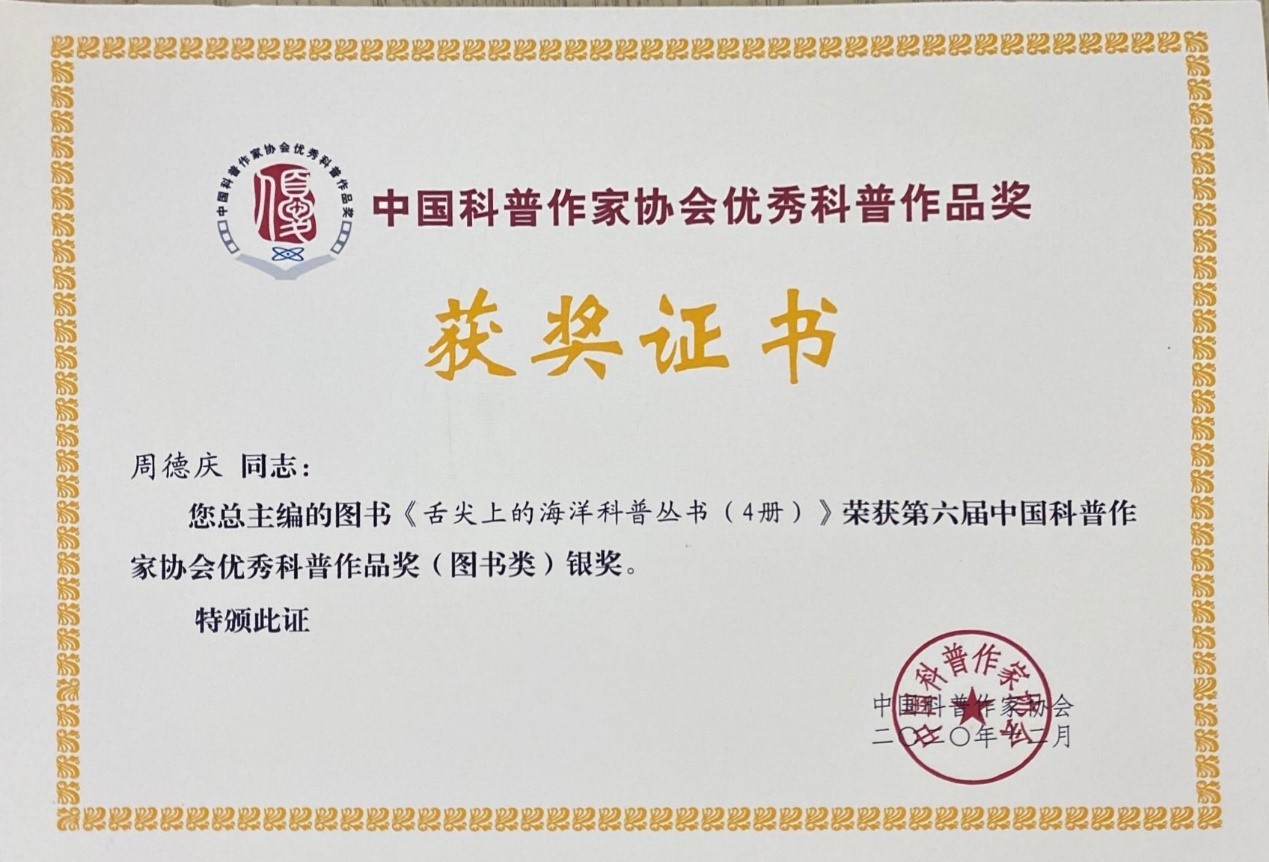 11月13日,中国科普作家协会公布了第六届“中国科普作家协会优秀科普作品奖”获奖作品名单,评选出科普图书类金奖作品10种、银奖作品19种。中国水产科学研究院黄海水产研究所周德庆研究员作为总主编编著的“舌尖上的海洋”科普丛书(四册)榜上有名,获得科普图书类优秀科普作品银奖。