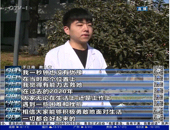 于江南同学于1月10日上午9:00左右经过青岛奥帆中心附近海域时,发现一名女子正向海水深处走,一秒钟也没有犹豫,就翻过护栏跳进了海里,同另一位青年人一起进行营救,成功挽救了一条生命。当时气温低至零下4℃,海水冰冷刺骨,但于江南等人于危难之际能够挺身而出,为他人伸出援手的无畏担当精神和表现出的社会责任感仿佛一股寒冬里的暖流,温暖了在场的每一个人。