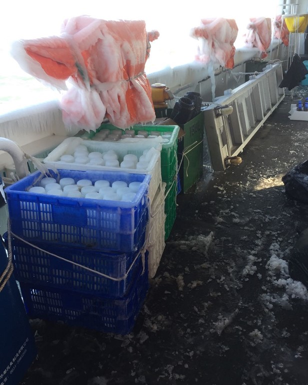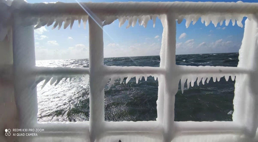 本航次于1月5日从青岛启航,累计航行2750海里,调查站位50个。航次不仅要面对疫情防控的考验,还经历了近90年来的低温和暴风雪,山东黄海沿岸局部气温降至-20°C以下,海上的体感温度更低。调查中风雪交加,砭人肌骨,惊涛骇浪,零下十几度的低温把海浪冻在了船上,船头桅杆上长满了“冰喇叭”,甲板上结满厚厚的冰,这对船舶底拖网作业人员是巨大的挑战,对甲板采样和仪器布放人员也是巨大的考验。全体出海人员按照冬季科考应急处置的相关部署和以往冬季调查历练的丰富海上作业经验,不畏严寒、迎难而上、栉风沐“雪”、砥砺“航”行,按照既定船时、既定线路,出色的完成了超强冷空气期间的目标站位作业任务,获取了渔业资源、鱼卵仔稚鱼、生物环境、理化环境等数据1000余份,为掌握越冬群体的资源结构和数量分布、主要渔业种类的洄游分布规律、预估来年产卵群体资源量和资源补充能力提供了数据基础,为国家渔业资源的管理和养护措施的调整提供支撑。