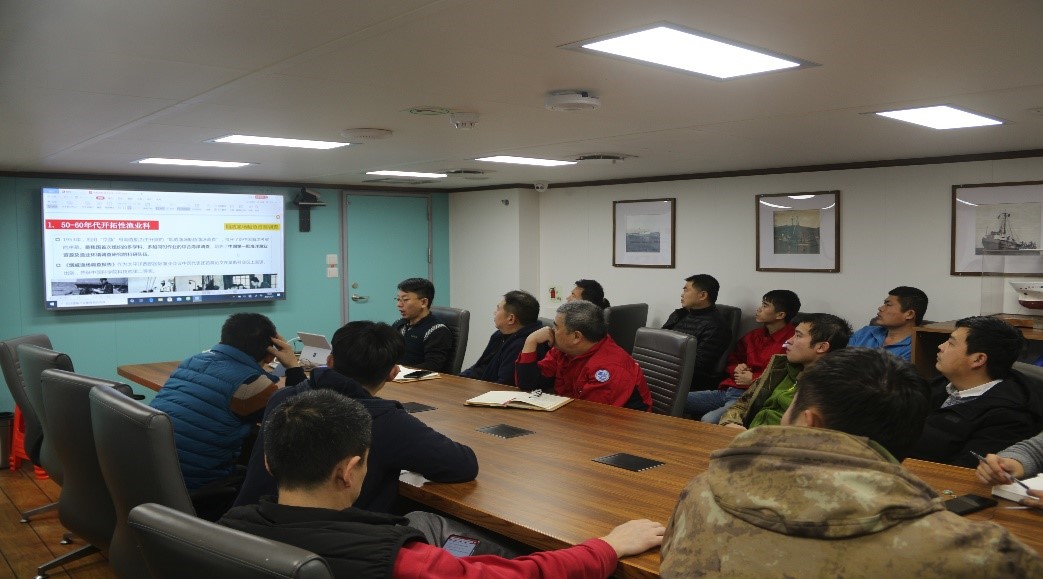调查间隙,大家还一起认真回顾学习了黄海水产研究所渔业科考精神,加深了对“团队协作、勇于担当、严谨求实、拼搏奉献”的渔业科考精神的认识和理解?;坪K芯克弦槐部蒲Ъ移床钕椎木裨诖校率贝摹袄逗>瘛痹谏凉?。