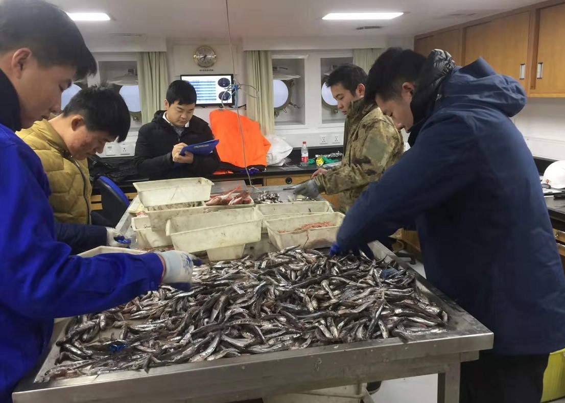 突如其来的疫情,考验了海洋科考人“临危不乱、处置果敢、认真负责、勇于担当”的基本素养;冰冷刺骨的暴风雪,展现了全体出海人员不畏艰险、团结协作、勇于担当的精神风貌。80%的队员顶着严重晕船的身体不适,他们有的年近花甲,有的才刚刚20岁,都在坚持和坚守,携手奋进,砥砺前行。戴芳群高级实验师已近花甲之年,航次中每一个调查站位都能看见他忙碌的身影,他还亲自带队完成了50个站位的渔业生物学测定,累计7000余尾。为保证测定数据的准确性,他整个过程都没有戴手套,手上多处冻伤。自1980年参加工作以来,戴老师在渔业科考的岗位上默默奉献了四十余年,充分展示了一名共产党员的风采,一名一线科研工作者的担当。