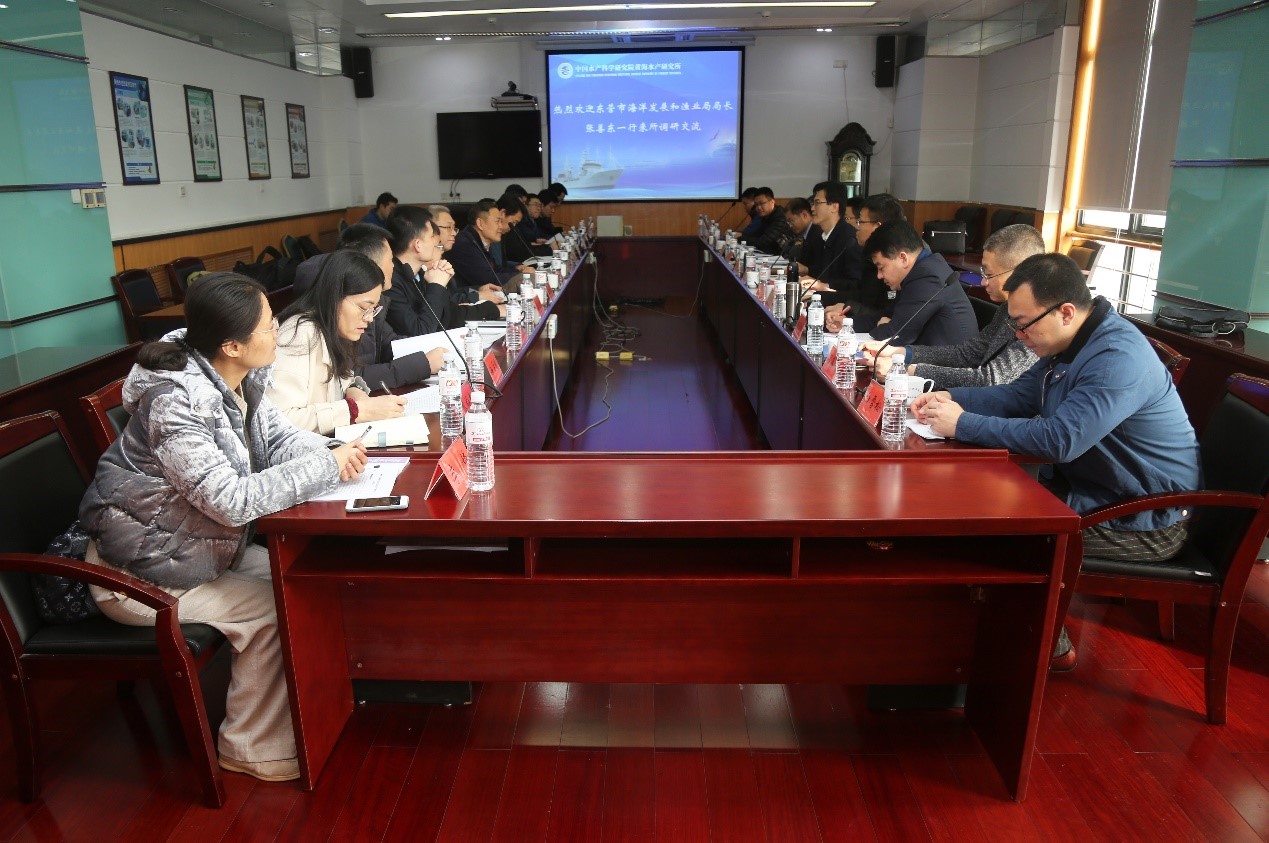 2月26日,东营市海洋发展和渔业局局长张善东、副局长张宝民及多家企业负责人一行到中国水产科学研究院黄海水产研究所交流访问?;坪K芯克彼た捉?、成果转化处处长王印庚及相关专家接待了张善东局长一行,并进行了座谈。