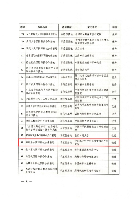4月26日,科技部国际合作司公布了科技部国家国际科技合作基地2020年度综合绩效评估结果,依托中国水产科学研究院黄海水产研究所建设的科技部海洋渔业国际科技合作基地获评“优秀”。