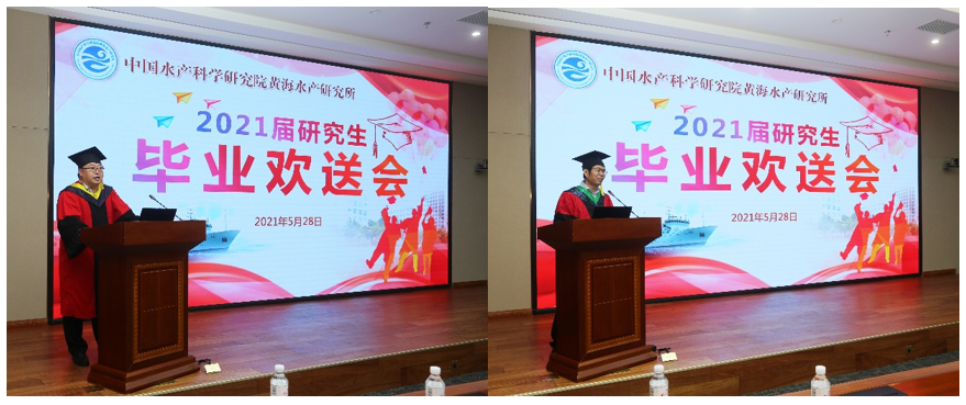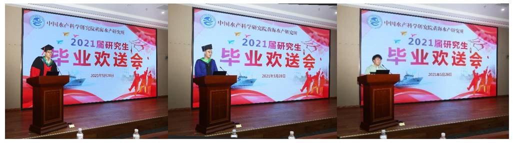 研究生支部委员滕广亮博士、研究生学会会长王枫林两位同学作为毕业生代表,各自讲述了自己在黄海水产研究所求学与科研的过往点滴,感谢黄海水产研究所各位导师的培养,并将始终牢记“创新、求实、团结、奋进”的所训,继续为我国海洋科研事业贡献自己的力量。研究生支部委员张双勇作为在读研究生代表表示,师兄、师姐们为他们在黄海水产研究所这个温暖团结的大家庭中脚踏实地、刻苦钻研的求学之路做了榜样,激励他们继续秉承严谨求实的学习精神以及积极向上的生活态度,用正确的人生观、价值观、世界观为党、为祖国、为人民多作贡献。