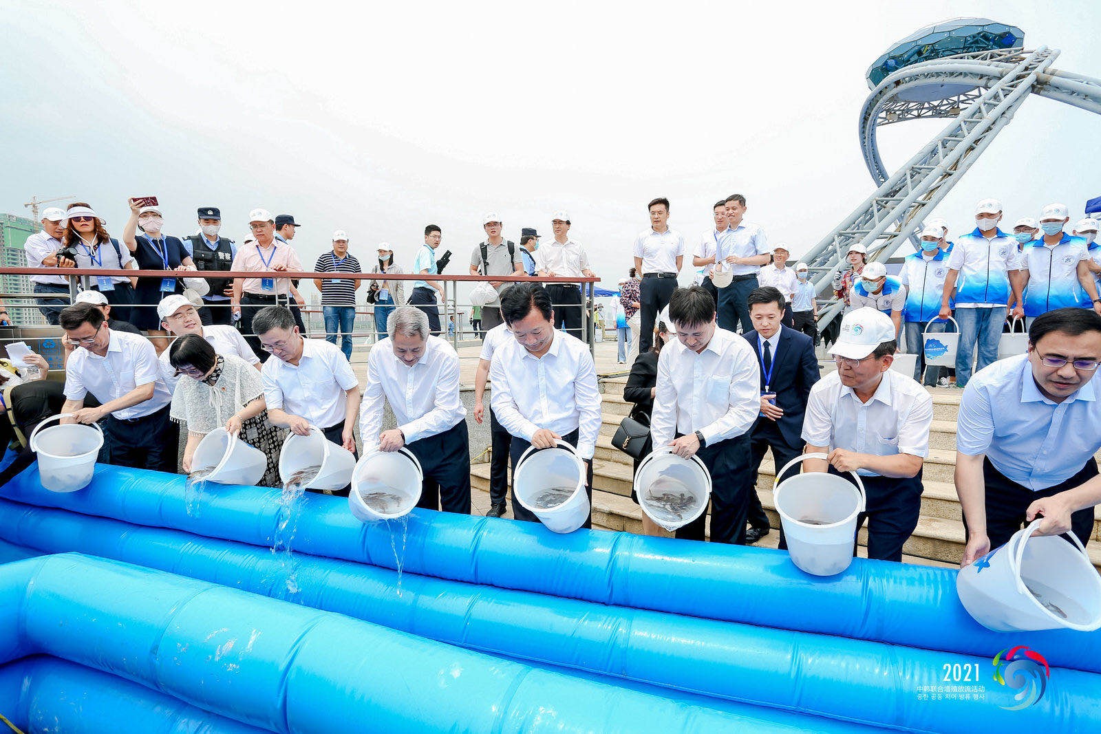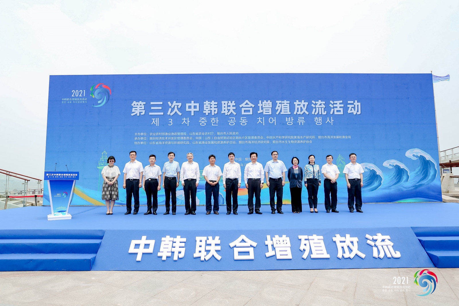 为?;せ坪S嬉底试春蜕肪?,根据中韩渔委会会谈达成共识,7月9日第三次中韩联合增殖放流活动通过线上线下相结合方式在中国烟台和韩国仁川同步举行。中方活动由农业农村部渔业渔政管理局、山东省农业农村厅、烟台市人民政府共同主办,烟台经济技术开发区管理委员会、中国(山东)自由贸易试验区烟台片区管理委员会、中国水产科学研究院黄海水产研究所、烟台市海洋发展和渔业局等单位共同承办。本次活动中韩双方向黄海投放绿鳍马面魨、黑鲷、小黄鱼和梭子蟹等经济物种共计100万尾。