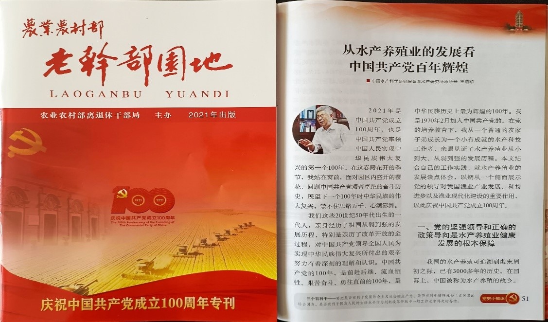 近日,农业农村部离退休干部局对离退休干部“庆祝中国共产党成立100周年”主题征文活动进行了表彰,中国水产科学研究院黄海水产研究所退休干部王清印荣获主题征文三等奖、薛立雪荣获主题征文优秀奖。农业农村部《老干部园地》“庆祝中国共产党成立100周年专刊”刊登了王清印撰写的《从水产养殖的发展看中国共产党百年辉煌》征文。