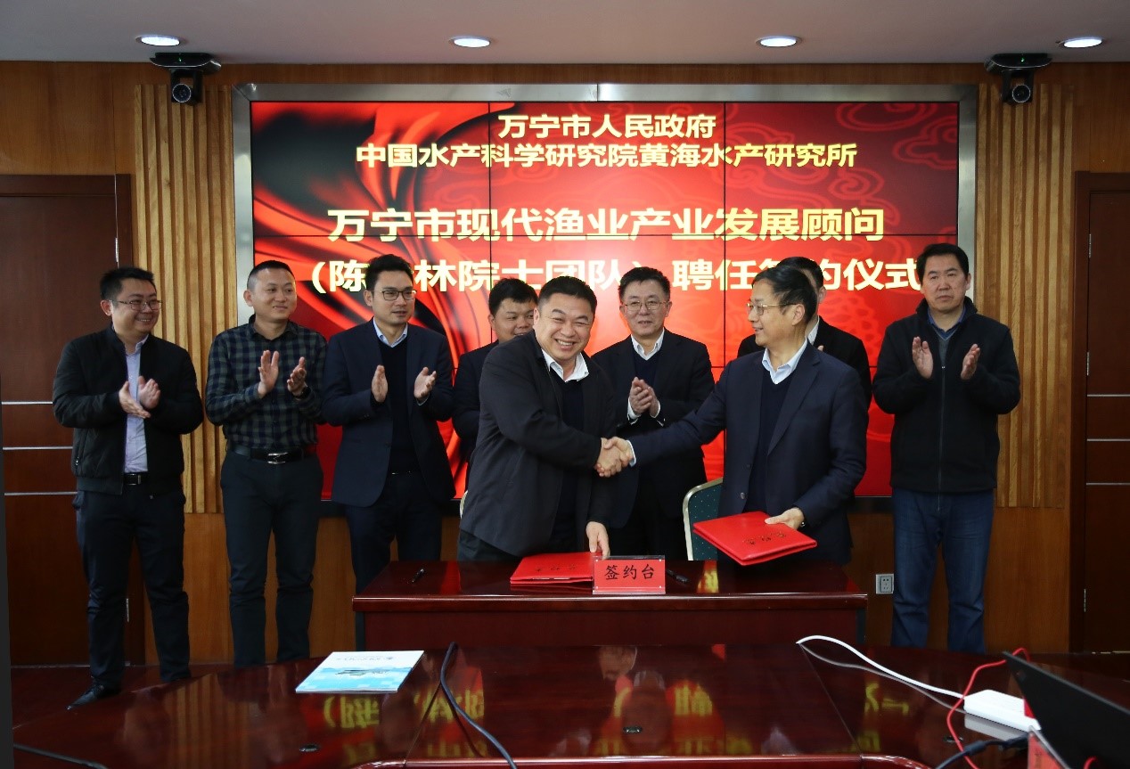 2月25日,海南省万宁市委副书记、市长王三防,副市长郑忠发等一行7人到中国水产科学研究院黄海水产研究所访问交流?;坪K芯克そ鹣允?、副所长荣小军、中国工程院院士陈松林以及成果转化处、基因组室等部门负责人、专家等接待了王三防市长一行,并进行了座谈。王三防市长与陈松林院士签订了万宁市现代渔业产业发展顾问聘任协议。