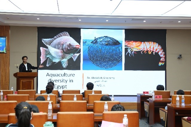 在科普讲座环节,海洋渔业生物资源库研发中心张波研究员、活体库Abdallah Ghonimy博士和微生物库杨冰研究员对国家海洋渔业生物种质资源库科普资源、“Aquaculture Diversity in Egypt(埃及丰富多彩的渔业生物)”和“海水养殖动物健康漫谈--争做海洋动物健康小卫士”等分别进行了宣讲。专家讲座图文并茂、深入浅出地介绍了丰富多彩的海洋渔业生物和海水健康养殖的相关知识,并与线上、线下的观众进行了交流、互动。随后,参加活动的同学实地参观了科普展厅,专家们生动、耐心的讲解和资源库丰富的生物资源样本让同学们听得着迷、看得入神。参观结束后,全程参加活动的同学获赠由海洋渔业生物资源库研发中心和黄海水产研究所“渔业资源增殖与养护团队”联合制作的《黄渤海鲸类的研究与?;ぁ房破栈姹?,表现优异的同学获颁此次活动的研学证明。