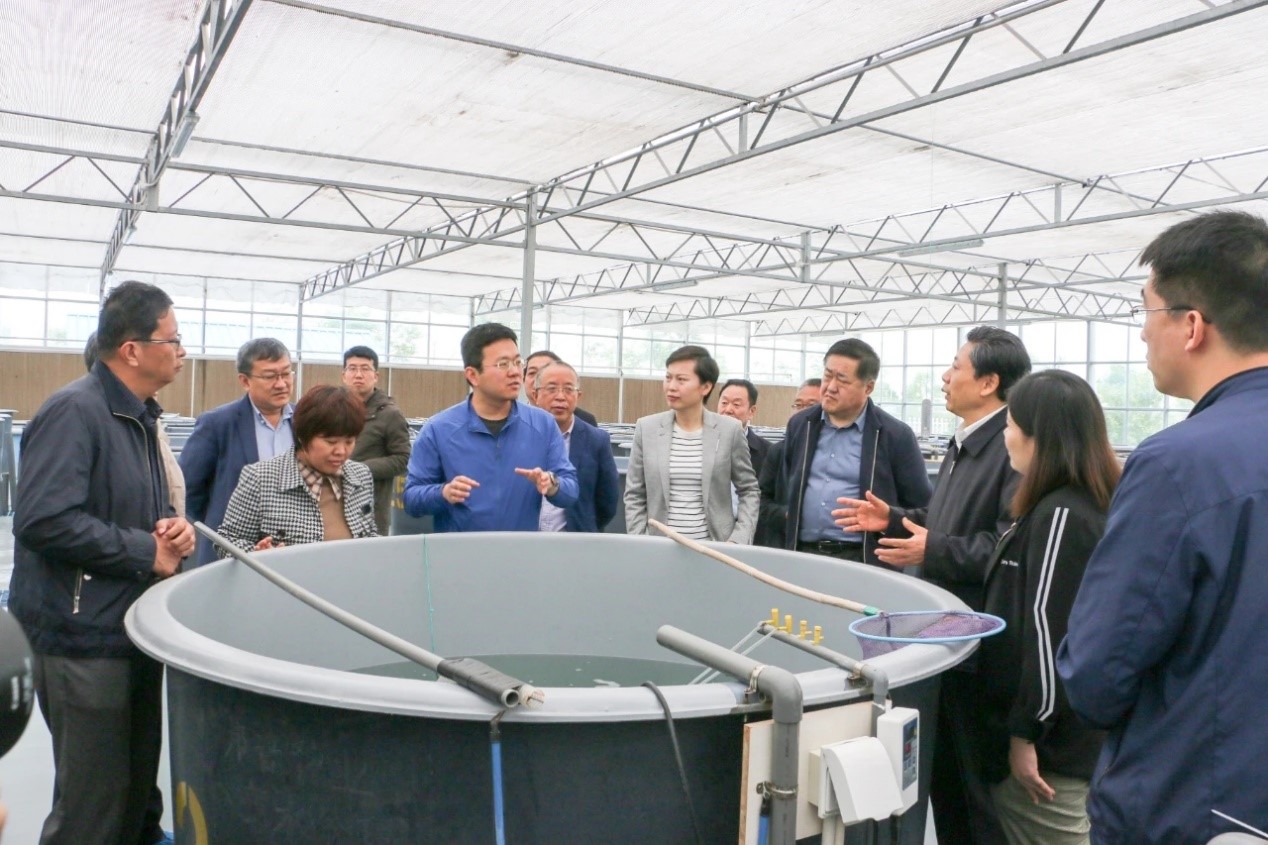 代平同志在凡纳滨对虾联合育种基地为山东省政协副主席王艺华等领导介绍凡纳滨对虾种业情况