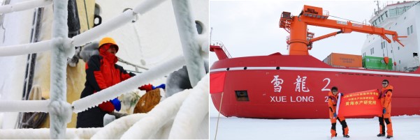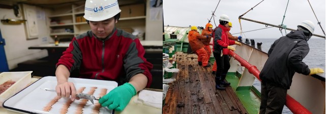 图5.(左:磷虾资源探捕调查;右:王新良、许庆昌参加中国第36次南极科学考察)