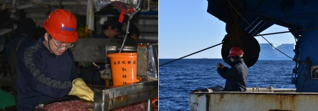 图3.樊钢洲(左:兼捕鱼类取样;右:海鸟与哺乳动物观测)