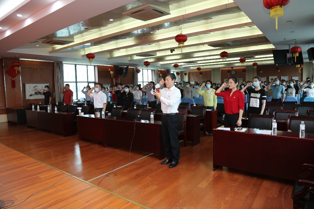 赵宪勇书记带领全体参会党员重温入党誓词。面对鲜红的党旗,党员们举起右手、紧握拳头、庄严宣誓。铮铮誓词让每一名党员精神振奋,坚定信仰,永葆忠诚干净担当的政治品格,充分发挥基层党组织战斗堡垒作用,以实际行动兑现对党的庄严承诺。