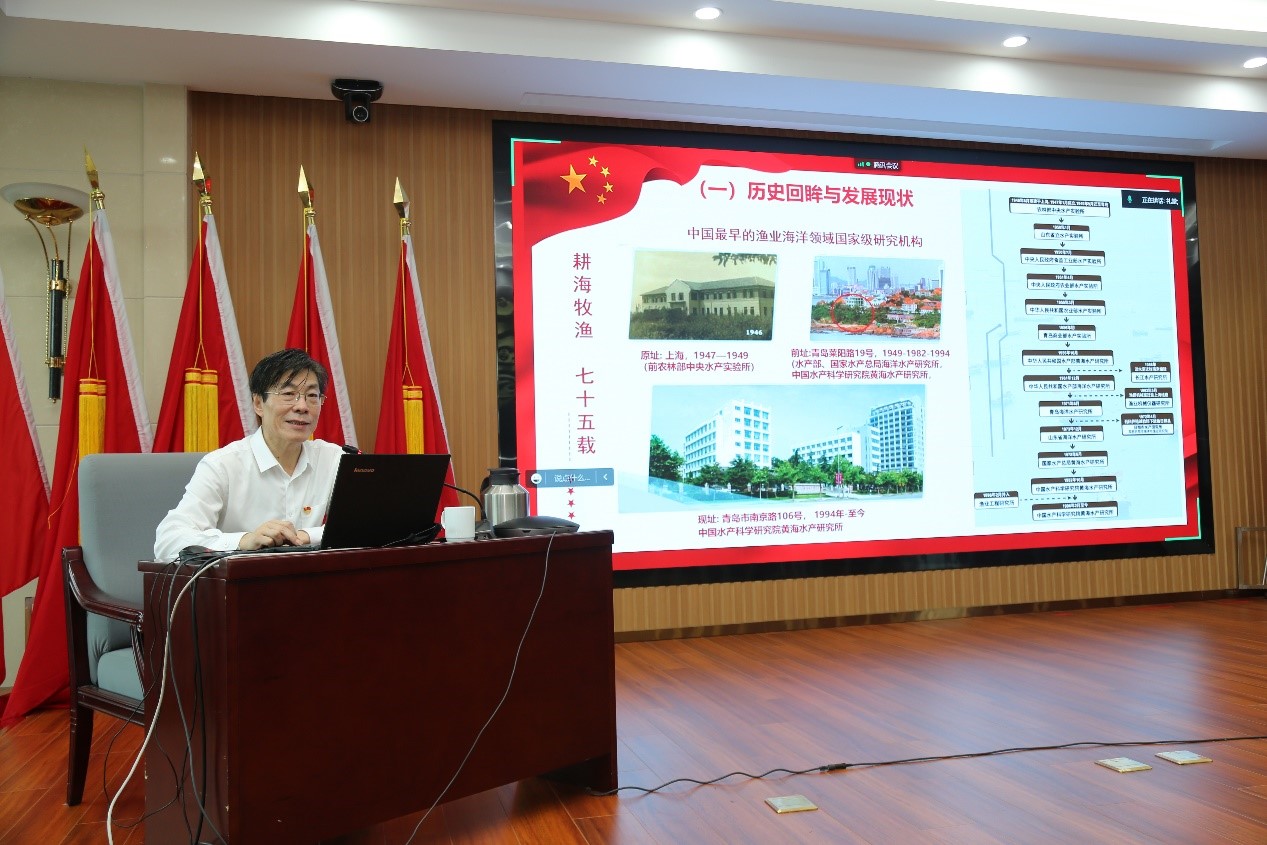 赵宪勇书记的专题报告从黄海水产研究所“七十五载薪火相传,老科学家精神屡创辉煌”“新时代赋予新使命,新一代不负使命勇担当”“胸怀‘国之大者’,科技自立自强重任大家扛”三个方面展开,带领全体党员回顾了黄海水产研究所七十五载的辉煌成就以及涌现出的老一辈科学家求真务实的典型事迹,激励大家要继续传承和弘扬老科学家精神,同时也要向身边默默奉献、埋头苦干的优秀科研工作者代表看齐。他强调,党的十八大以来,以习近平同志为核心的党中央把科技创新摆在国家发展全局的核心位置,作出战略谋划和系统部署,围绕加快推进科技创新、建设世界科技强国,对科技工作者提出一系列要求。作为国家渔业战略科技力量国家队,更要深刻理解“科技自立自强是国家强盛之基、安全之要”,树牢“大食物观”,从满足人民美好生活出发,坚守主责主业,勇于担当作为,以科技创新为目标,以科技报国为使命,按照习近平总书记“完整、准确、全面贯彻新发展理念,深入实施创新驱动发展战略,把科技命脉牢牢掌握在自己手中”的要求,心系“国家事”、肩扛“国家责”,自觉肩负起党和人民赋予的科技创新支撑现代渔业绿色高质量发展重任,以优异成绩迎接党的二十大胜利召开。