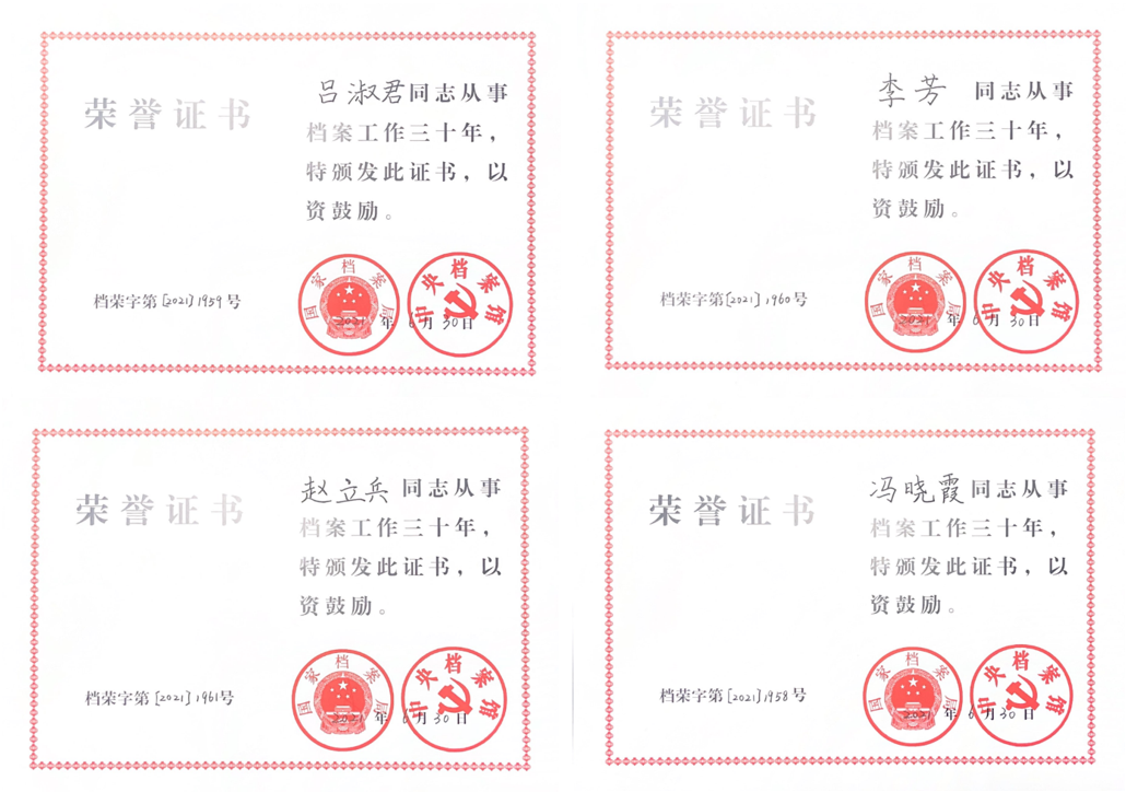 档案工作是党和国家的一项重要工作,是维护党和国家历史真实面貌的一项不可缺少的重要事业。近日,中国水产科学研究院黄海水产研究所冯晓霞、吕淑君、李芳、赵立兵等4位档案工作者荣获国家档案局、中央档案馆从事档案工作三十年荣誉证书。这是对他们数十年如一日,为档案事业辛勤付出、无私奉献精神的充分鼓励和肯定。