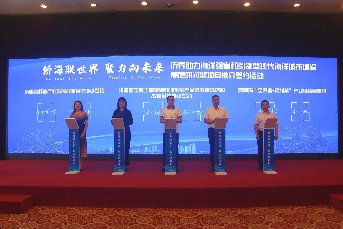 会上,王印庚研究员作为中国侨联特聘专家对山东省海洋渔业重点项目进行现场推介。他从山东省海洋渔业发展现状、区位优势和黄海水产研究所技术成果储备出发,提出了“百万吨浒苔藻蛋白的挖掘及其生物质资源利用”“胶东半岛海带养殖集群与转型升级发展”“北方滩涂贝类苗种产业化基地建设及其种业开发”“滨海渔光盐一体化产业园区建设与高效开发”等5个海洋渔业重点项目,希望通过实施创新性产业化项目集群,实现总体经济增效数百亿元的产业目标,从而推动山东省海洋渔业高质量发展。与会现场,黄海水产研究所与济南极源生物科技有限公司就联合开展南极磷虾产品研发、质量评价、标准制订与产品推广等方面签署了战略合作协议。