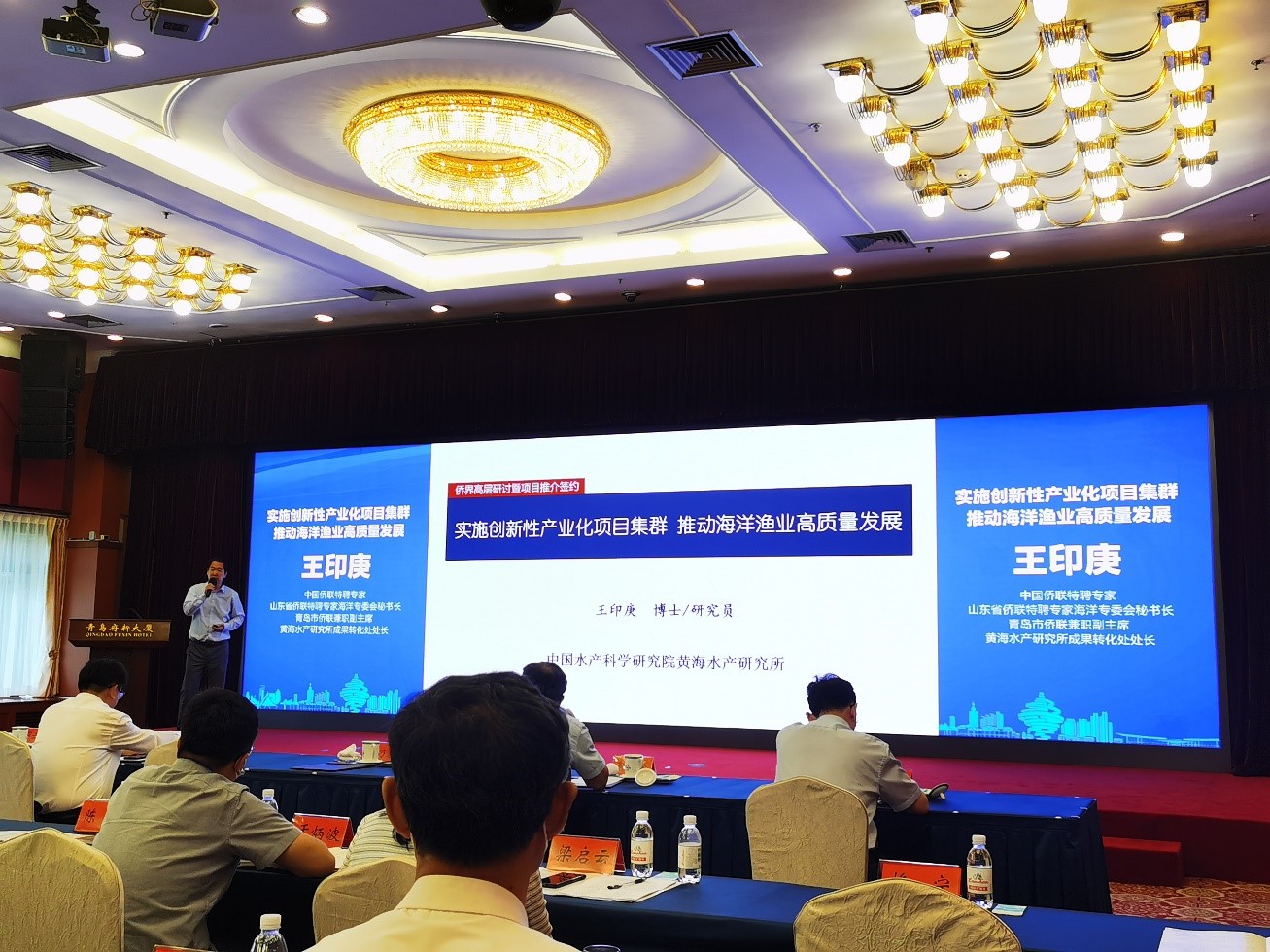 为全面推进侨界助力海洋人才培养、海洋科技创新和海洋产业发展,9月6日,“侨海联世界 聚力向未来—侨界助力海洋强省和引领型现代海洋城市建设高层研讨会暨项目推介签约活动”在青岛隆重举办。本活动由山东省侨联、青岛市侨联、中国侨联特聘专家委员会海洋专委会、山东省侨联特聘专家委员会海洋专委会主办,中国水产科学研究院黄海水产研究所为协办单位之一?;坪K芯克晒ΥΤね跤「芯吭钡?位专家应邀参加会议并做重点项目推介。