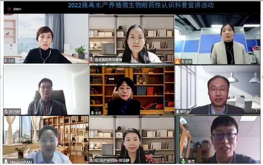 11月24日,由全国水产技术推广总站、中国水产科学研究院黄海水产研究所主办,国家海洋渔业生物种质资源库微生物分库、联合国粮食及农业组织(FAO)水产养殖抗微生物耐药和生物安保参考中心、海洋渔业生物资源库研发中心承办的“2022提高水产养殖微生物耐药性认识网络科普宣讲活动”成功举办。全国水产技术推广总站总工程师李清、中国水产科学研究院黄海水产研究所副所长叶乃好、农业农村部渔业渔政管理局养殖处相关负责人出席活动,会议先后由黄海水产研究所张庆利主任和珠江水产研究所王庆主任主持。来自各地渔业主管部门、推广、科研、高校、兽药和养殖生产企业等单位代表和养殖户300人报名参加,2000多人通过“中国兽医发布”直播观看。