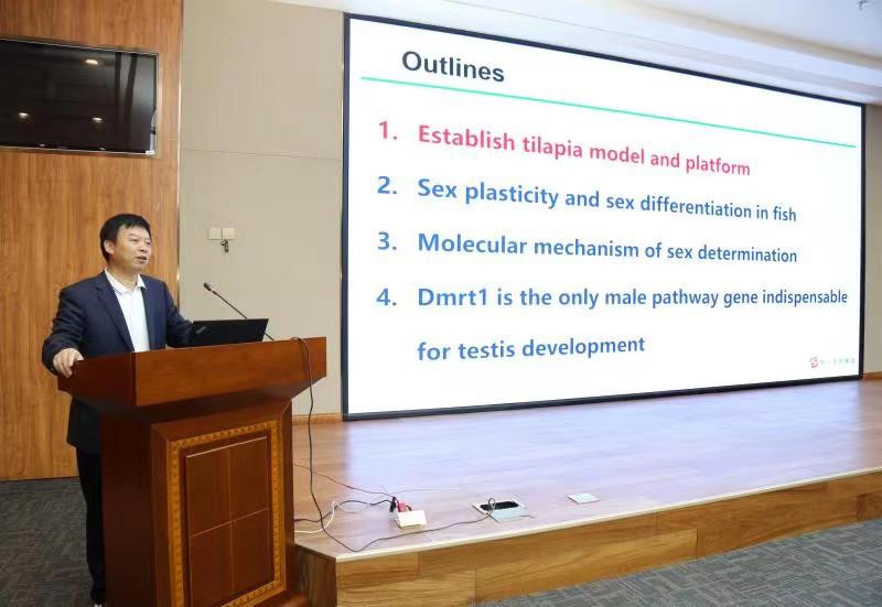 聘任仪式后,王德寿教授做了题为“通过基因编辑解析罗非鱼性别决定与分化的分子机制”的学术报告。从选定罗非鱼作为性别决定和分化的研究模型引入,系统介绍了鱼类性别的可塑性、性别决定的分子机制、dmrt1基因功能的研究成果等,最后以单个基因突变为例,提出性染色体进化和性别决定机制转换的思考。报告为海水生物性别决定和分化以及基因编辑技术领域的专家学者提供了新思路,也为海水养殖生物基因编辑育种技术创新提供了借鉴和参考。