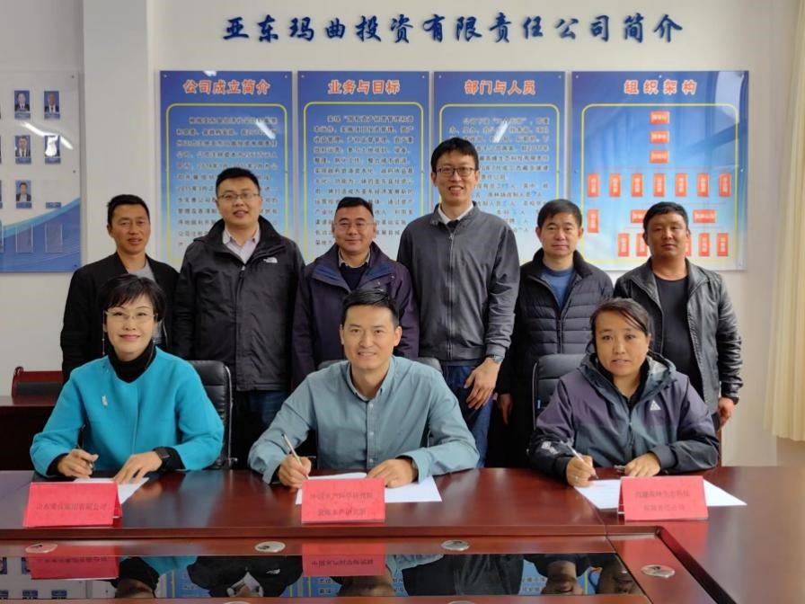 美佳公司代表郭晓华(左一)、黄海水产研究所代表徐后国(中)和高峰公司代表洛松卓玛(右一)签署“科技助力亚东鲑产业高质量发展产学研合作协议”