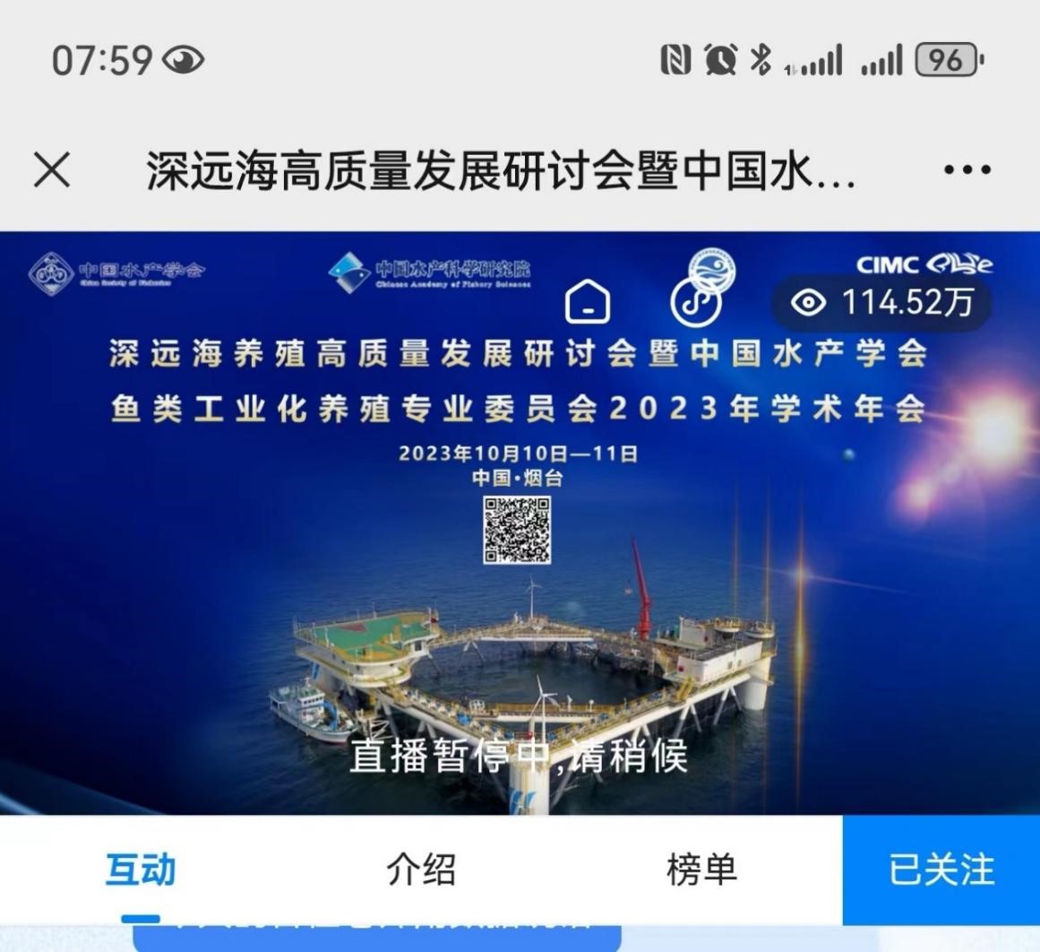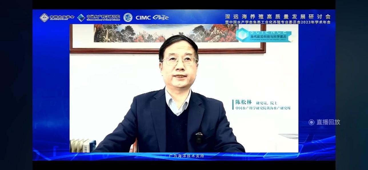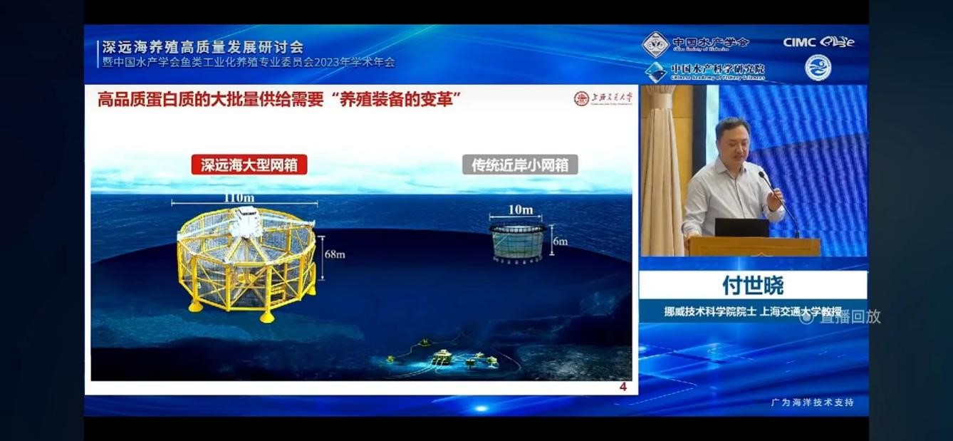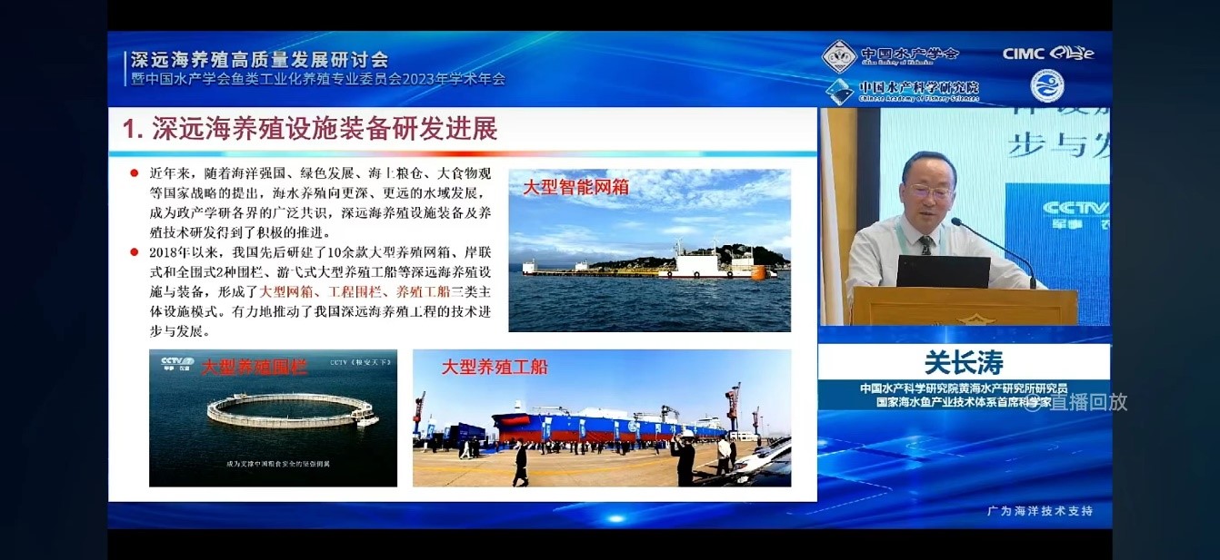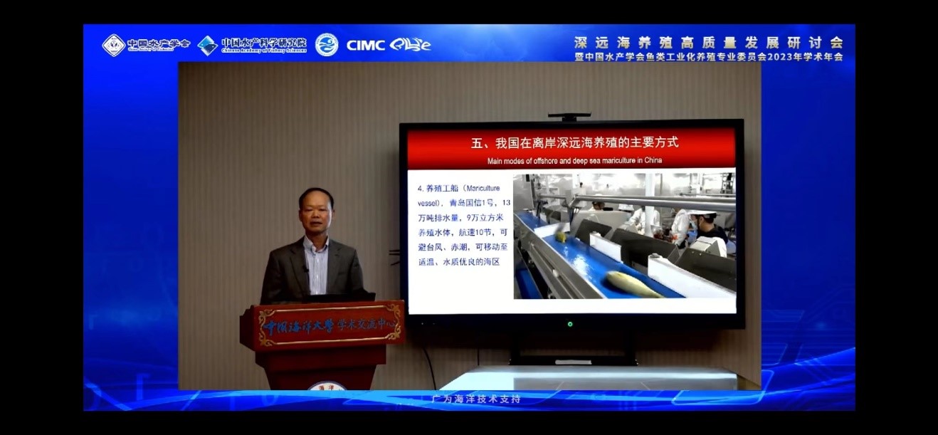 中国水产学会秘书长、全国水产技术推广总站站长崔利锋在讲话中指出,深远海养殖是我国渔业现代化建设的重要方向之一,科技创新驱动深远海养殖高质量发展大有可为。中国水产科学研究院副院长林祥明介绍了中国水产科学研究院在深远海养殖领域取得的重要创新成果,强调养殖设施安全、装备智能化和深远海新品种是下一步攻关的重点内容。山东省农业农村厅总农艺师郭鹏、烟台市海洋发展和渔业局局长孙华君、烟台中集蓝海洋科技有限公司总经理郭福元分别就省、市和企业在深远海养殖方面的进展进行了阐述。农业农村部渔业渔政管理局养殖处主任科员刘莎莎出席会议。