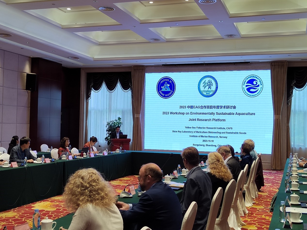 10月16日至20日,中国水产科学研究院黄海水产研究所与挪威海洋研究所在山东荣成举办了中挪可持续水产养殖联合研发平台学术研讨会。挪威驻华大使馆发展参赞Knut Arild Thonstad、黄海水产研究所副所长荣小军、挪威海洋研究所全球发展办公室主任Ann Lisbeth Agnalt、荣成市海洋发展局副局长楚海军分别致辞。挪威驻华大使馆环境参赞 Elin Merete ?kstad、挪威海洋研究所研究员?ivind Strand及其团队成员、LongLine环境有限公司负责人 Joao Ferreira、黄海水产研究所研究员方建光、荣成楮岛水产有限公司总经理王军威等40余位专家及相关企业代表出席了本次研讨会?;嵋橛苫坪K芯克鼋苎芯吭焙团餐Q笱芯克?ivind Strand研究员轮流主持。