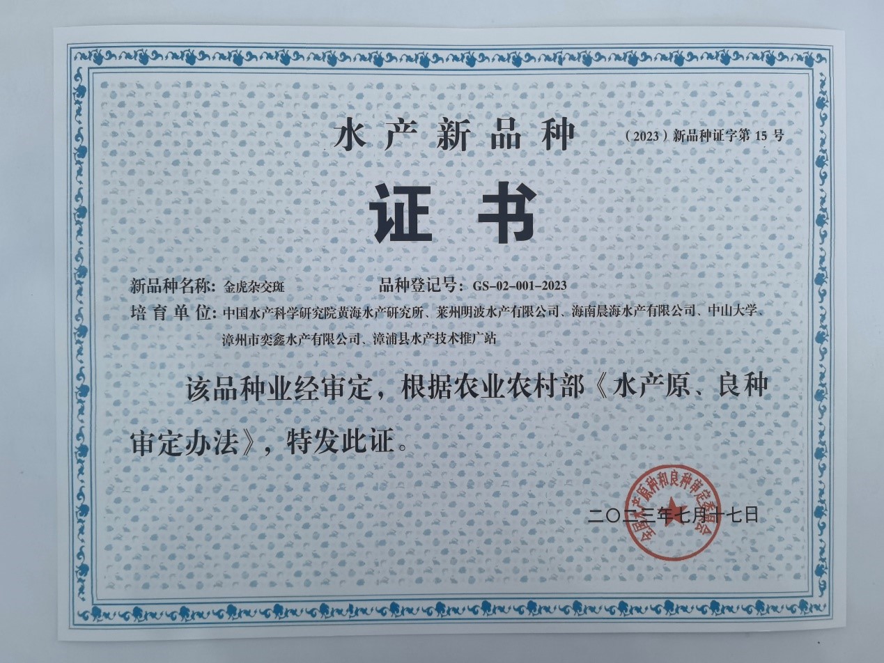 此次展会还颁发了2023年经国家审定的17个水产新品种证书,其中,黄海水产研究所培育的石斑鱼“金虎杂交斑”和中国对虾“黄海6号”位列其中。