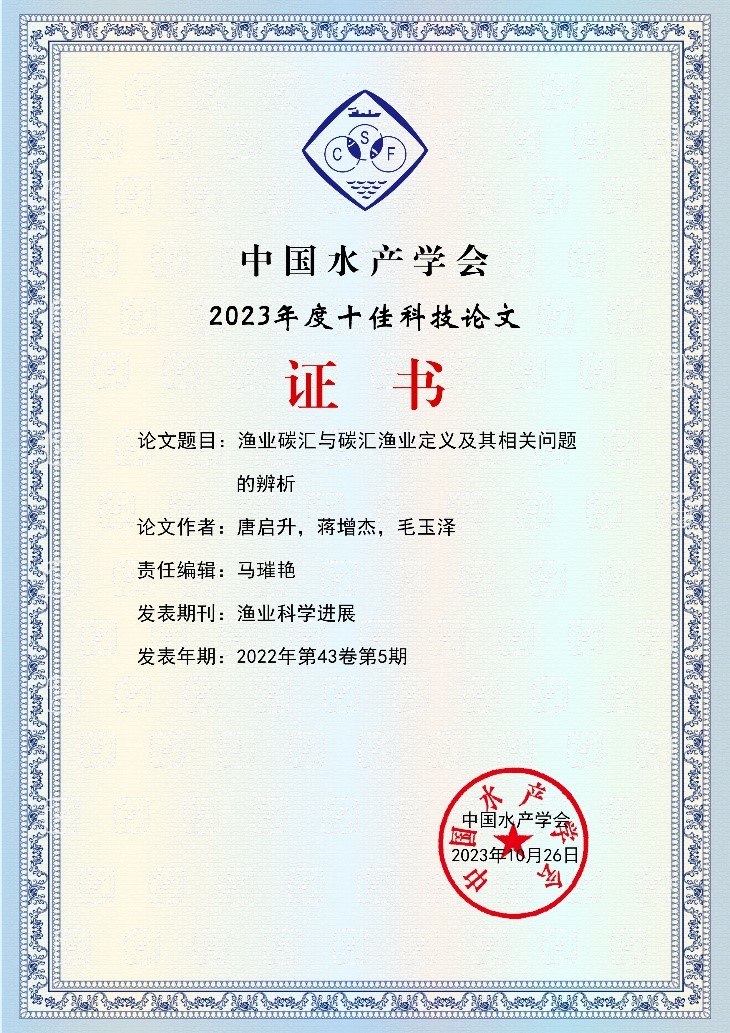 《渔业碳汇与碳汇渔业定义及其相关问题的辨析》由中国水产科学研究院黄海水产研究所唐启升院士等人撰写。该文基于联合国政府间气候变化专门委员会(IPCC)关于碳汇和碳源的解释和水生植物固碳特点,对2010年提出的渔业碳汇和碳汇渔业的定义进行了修订,强调了渔业碳汇功能和增汇的三种基本表达方式和水生植物在渔业碳汇中的重要作用,提出了贝类驱动的“使用碳、移出碳、储存碳、释放碳”四大碳库的分类和“总碳汇、净碳汇”等系列新术语,依据主要养殖经济贝类能量收支的研究结果证实了贝类养殖是碳汇而不是碳源,建立了捕捞渔业群体碳汇评估“新模型”,获得了渔业碳汇效能的“新结果”,进一步从建立碳汇渔业示范区、开展渔业碳汇扩增专题研究、碳汇渔业交易实践探索等方面提出健康持续、深入发展碳汇渔业的相关建议,为碳汇渔业研究的发展提供了方向性的指引。
