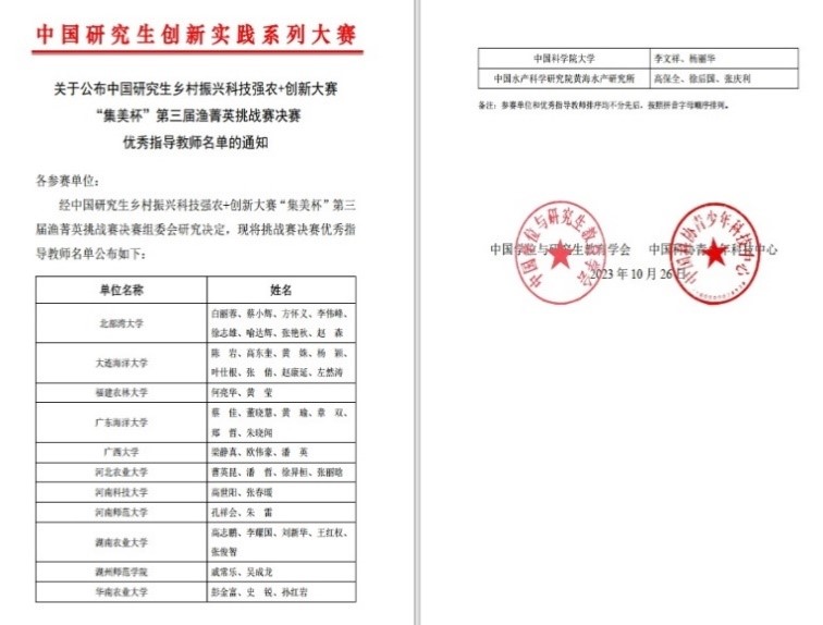 渔菁英挑战赛是我国水产学科和渔业领域的一项国家级赛事,旨在激励研究生将理论创新与农业实践相结合,用所学所识服务于乡村振兴。此次黄海水产研究所参赛队伍在大赛中斩获佳绩充分展现了我所研究生过硬的专业素质和优良的精神风貌,希望全所研究生以获奖队伍为榜样,再接再厉、笃行不怠,注重实践锻炼和创新思维的培养,积极为乡村振兴贡献力量。