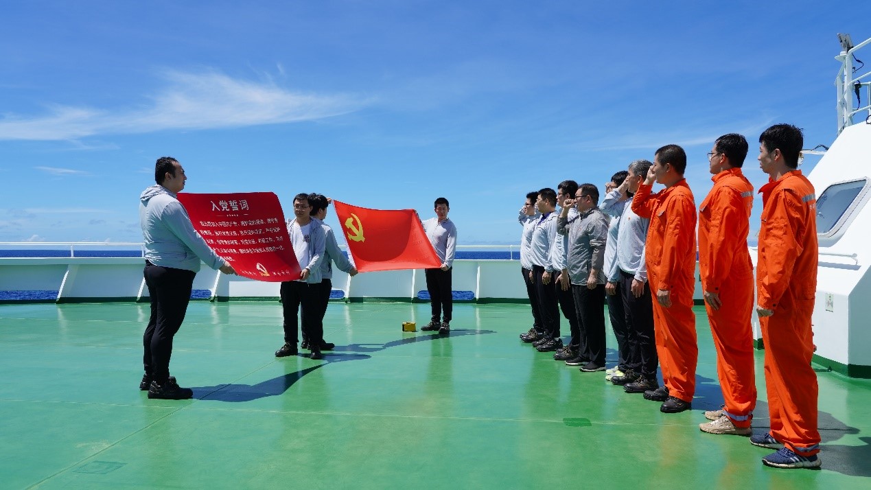 上午10时50分,《义勇军进行曲》庄严奏响,升旗仪式正式开始。海上工作组全体成员齐唱国歌,肃立注目五星红旗冉冉升起。随后,中西印度洋公海渔业资源调查临时党支部全体成员集结于党旗前,肃穆重温入党誓词,郑重表达对党的坚定信仰和对祖国科研事业的责任担当。