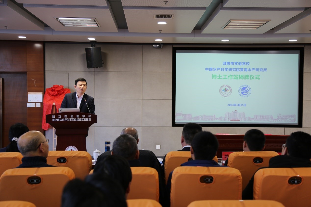 1月15日,中国水产科学研究院黄海水产研究所博士工作站揭牌仪式暨潍坊渔业产业技术研究院渔病远程诊断系统启动会在潍坊市实验学校召开。黄海水产研究所副所长荣小军,潍坊市教育局党组成员、副局长井光进,潍坊市海洋发展和渔业局党组成员、副局长窦海燕,潍坊市实验学校校长鞠克亮,黄海水产研究所研究员、潍坊渔业产业技术研究院院长毛玉泽以及博士工作站首批入驻博士、教师和企业代表等80余人参加揭牌仪式。
