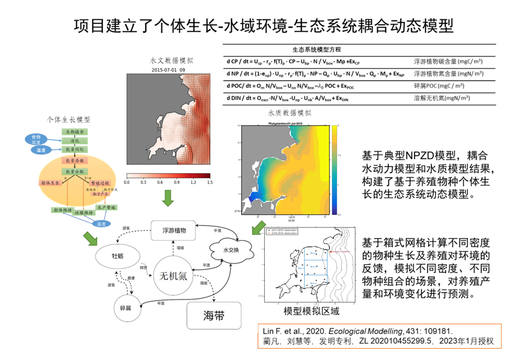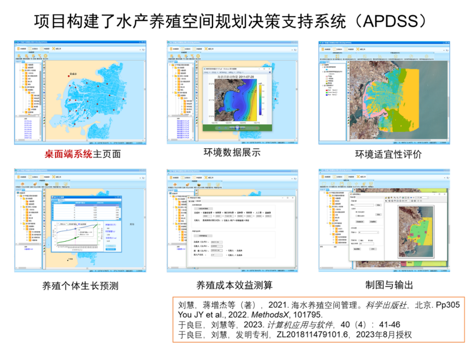 “基于生态系统的海水养殖空间规划技术创建与集成应用”成果由黄海水产研究所与中国科学院烟台海岸带研究所、自然资源部第二海洋研究所等7家单位共同完成。该成果遵循基于生态系统的海洋管理与空间规划理论,构建了海水养殖空间规划理论与技术体系;以我国北方典型养殖海区桑沟湾为研究对象,建立了高分辨率水动力和水质模型,实现了养殖海区水质参数及其时空演变过程精细化模拟;以环境数据为驱动因子,构建了海带、牡蛎、扇贝、鲍等主要海水养殖生物动态能量学模型,实现了生物个体生长模拟和预测;以水质模型和养殖生物个体生长模型为基础,建立了养殖容量评估模型,实现了养殖容量动态评估;基于政策合规性和环境条件综合研判,建立了水产养殖适宜性评价方法;通过集成上述评估方法并进行软件开发,构建了基于GIS技术的桌面端和网络端“水产养殖空间规划决策支持系统”(APDSS),并在典型养殖区开展应用示范。APDSS集成了多维环境数据,具有良好的图形界面和可操作性,实现了环境数据查询与展示、海水养殖场选址合规性与环境适宜性评价、养殖生物生长预测和养殖容量评估,为海水养殖空间规划和生产管理提供了决策支持。项目取得发明专利2项、软件著作权7项,发表论著33篇(部)。经青岛市科技成果标准化评价,该成果技术成熟度为13级,技术创新度为3级,技术先进度为7级;该成果整体水平达到国际领先水平。