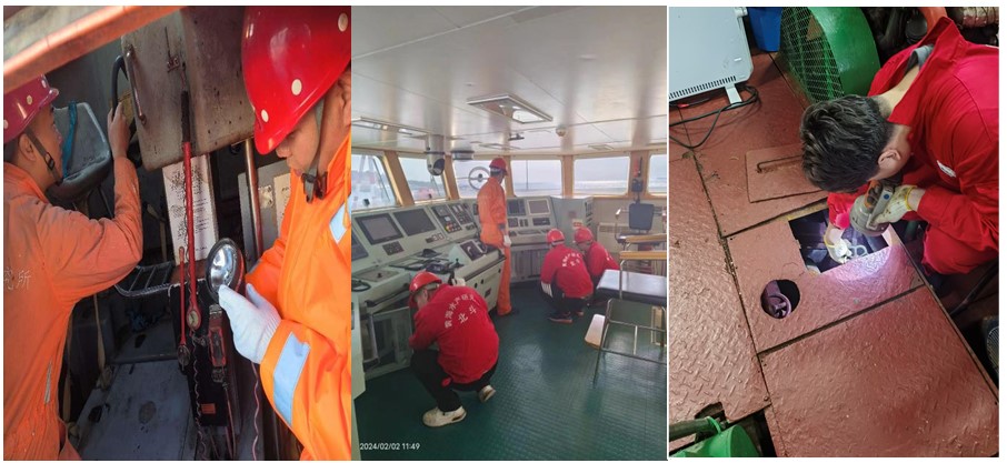 在调查船上,重点检查了救生设备、消防设备、航行设备、科考设备等,对关键设备进行全面细致检查,全面了解掌握船舶是否处于适航状态,并进一步强调了船舶人员24小时值班制度,务必保障船舶航行安全。