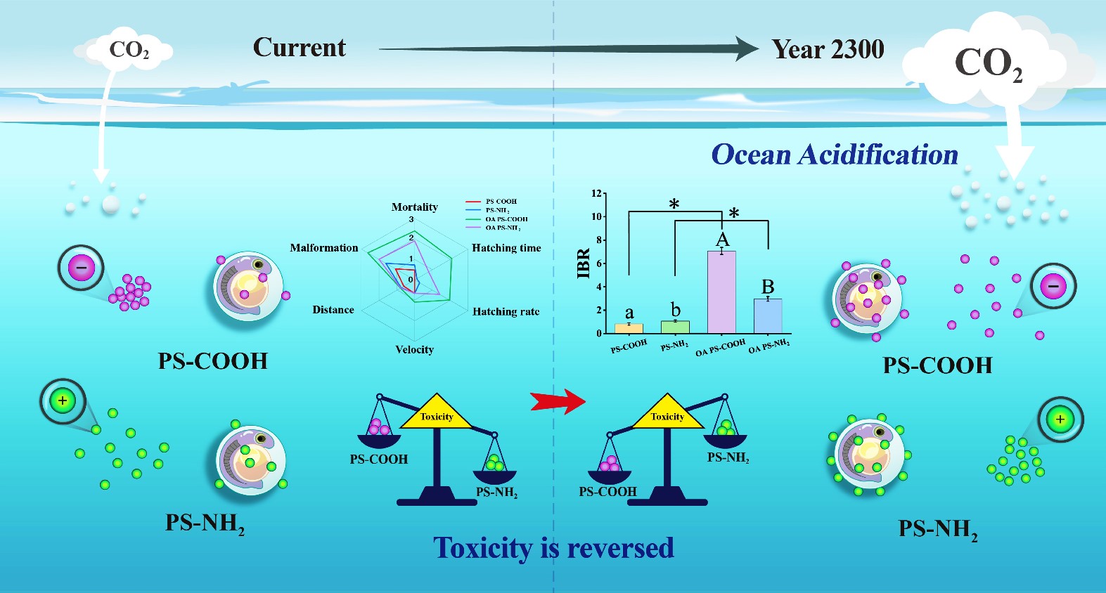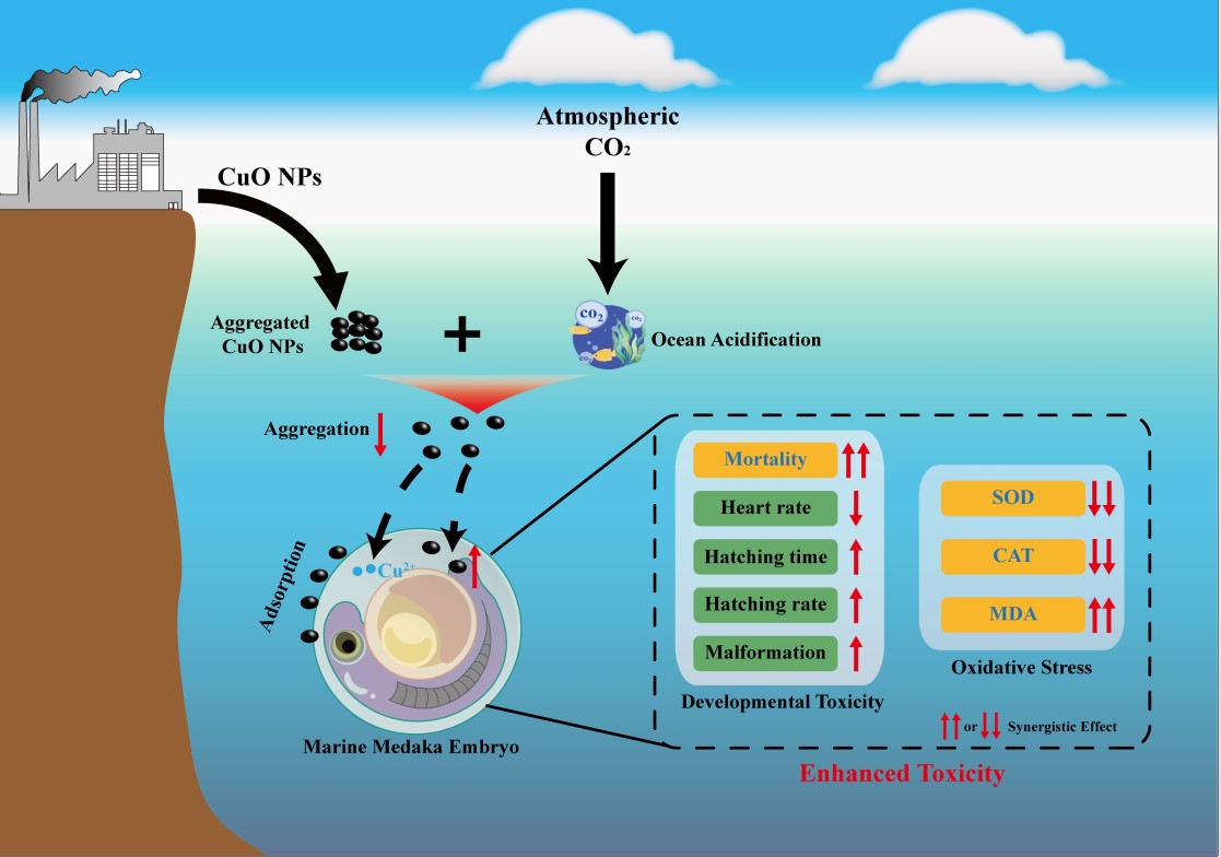 新污染物和气候变化是全球关注的重大环境问题?;坪K芯克撇澈S嬉瞪肪称兰塾肷镄薷创葱峦哦右缘湫托挛廴疚锬伤芰虾徒鹗裟擅卓帕N芯坎牧希阅J缴镄∏蛟搴秃K圜毼芯慷韵?,开展了海洋酸化耦合纳米CuO颗粒/聚苯乙烯纳塑料、UV-B辐射耦合纳米TiO2颗粒的生物毒性效应研究,系统阐明了气候变化耦合典型新污染物的海洋环境效应。