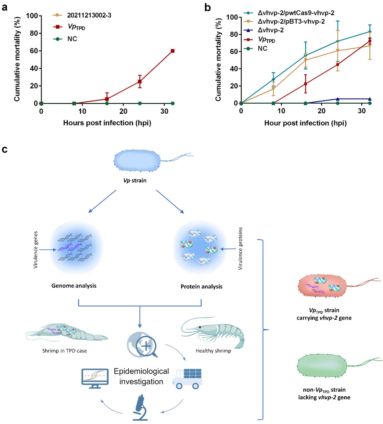 致玻璃苗弧菌关键毒力基因鉴定,发现VTPV因获得了关键毒力基因vhvp-2基因而对对虾仔虾具有了强毒力和高致死性