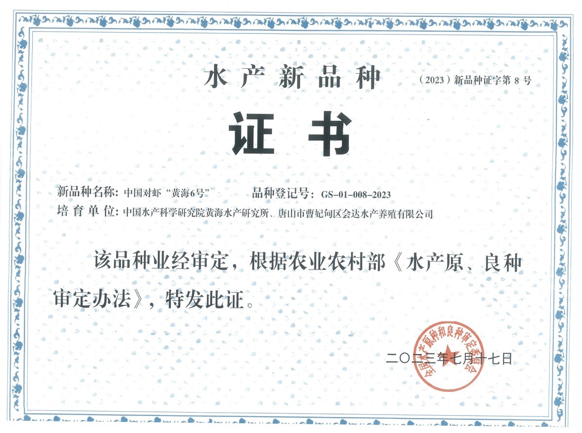 黄海水产研究所凡纳滨对虾和中国对虾遗传育种创新团队针对中国对虾养殖业的困境,立足于中国对虾产业提升和绿色发展,聚焦中国对虾低温耐受性、WSSV抗性、存活率和收获体重等主要选育性状,基于多性状复合育种技术进行中国对虾新品种选育,于2023年成功获批国审新品种“黄海6号”(水产新品种登记号:GS-01-008-2023),实现早放苗、晚收获(错峰),延长养殖时间,达到增产增收效果。