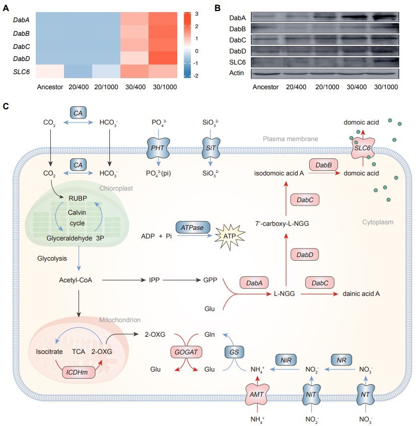 黄海水产研究所海洋藻类种质创制与利用创新团队以全球变暖和海洋酸化为背景,采用多学科交叉技术手段,通过短期应激和长期适应性实验、实验室模拟和海区现场实验等不同时空试验的对比验证,深入解析了多列拟菱形藻对海洋升温和酸化的生物学应答与调控机制。结果显示,海洋升温和酸化显著增加多列拟菱形藻软骨藻酸代谢水平,在长期适应条件下,多列拟菱形藻对温度和酸化具有较强的表型可塑性;升温和酸化显著提高软骨藻酸代谢核心基因DabA、DabB、DabC、DabD和SLC6表达,从而增加了细胞内外软骨藻酸的浓度。研究为全面解析赤潮硅藻毒素代谢机制奠定基础,为阐明气候变化下赤潮毒素产生机理及响应模式提供基础数据,同时为赤潮生物毒素的生态风险评估提供理论与技术支持。以上工作发表于国际知名期刊The ISME Journal。