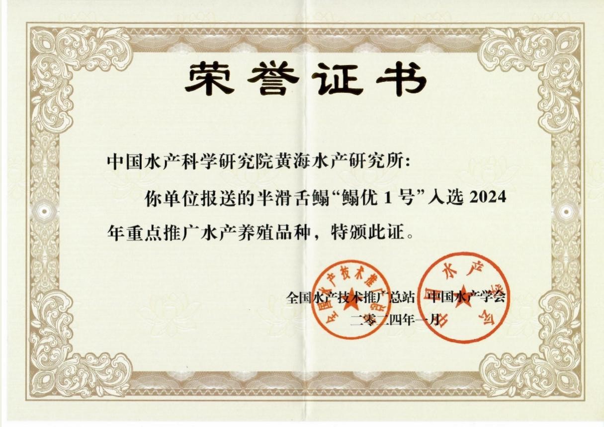 为充分发挥科技对渔业高质量发展和乡村产业振兴的支撑引领作用,加快渔业当家品种、优良品种和先进适用技术的推广应用,全国水产技术推广总站、中国水产学会组织开展了2024年重点推广水产养殖品种和重点推广水产养殖技术遴选工作。经省级水产技术推广部门推荐、专家评审等程序,共遴选出29个重点推广水产养殖品种和15项重点推广水产养殖技术(http://www.nftec.agri.cn/tzgg/202401/t20240111_8600419.htm)。中国水产科学研究院黄海水产研究所主导培育的半滑舌鳎“鳎优1号”新品种入选2024年重点推广水产养殖品种。