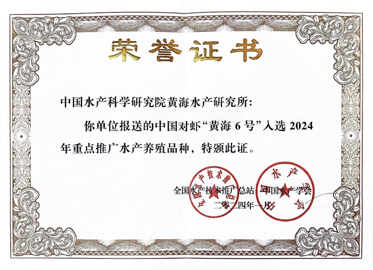 黄海水产研究所孔杰研究员团队与唐山市曹妃甸区会达水产养殖有限公司联合培育的中国对虾“黄海6号”,具有生长速度快,养殖成活率高,可实现提早放苗、错峰收获、延长养殖时间、保产和增产能力强等特点?!盎坪?号”与未经选育的中国对虾相比,低温半致死存活率、WSSV感染后半致死存活率和210日龄体重分别提高32.22%、27.74%和41.27%。“黄海6号”适宜在我国对虾主产区水温15℃~30℃和盐度20~33‰人工可控海水水体中养殖。通过重点示范推广,“黄海6号”已在河北省曹妃甸区、辽宁省丹东市等地产生了良好的经济、社会和生态效益,助推中国对虾养殖产业绿色健康可持续发展。