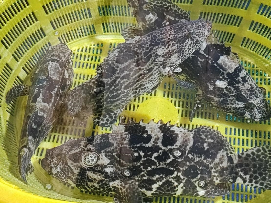 黄海水产研究所田永胜研究员团队与莱州明波水产有限公司、海南晨海水产有限公司和中山大学等单位联合培育的石斑鱼新品种“金虎杂交斑”,具有生长快、耐温广、耐低氧、耐低盐和营养丰富等优良性状。1-2龄金虎杂交斑体重较母本(棕点石斑鱼)提高74.4%-100.2%,较同类养殖种珍珠龙胆提高48.8%-60.7%;停食温度16℃,较母本降低3℃;耐低氧可达0.24mg/L,盐度适应范围8-35‰,肌肉中粗蛋白(20.2%)、必需氨基酸(7.7%)和总氨基酸(18.53%)含量均高于母本和普遍养殖种?!敖鸹⒃咏话摺笨梢栽谖夜KこЩ⒊靥?、网箱及西部半碱水环境中普遍养殖,其培育成功和广泛推广,为我国渔业现代化养殖提供了高效、优质的石斑鱼品种,将有力推动渔业种业创新和产业发展。