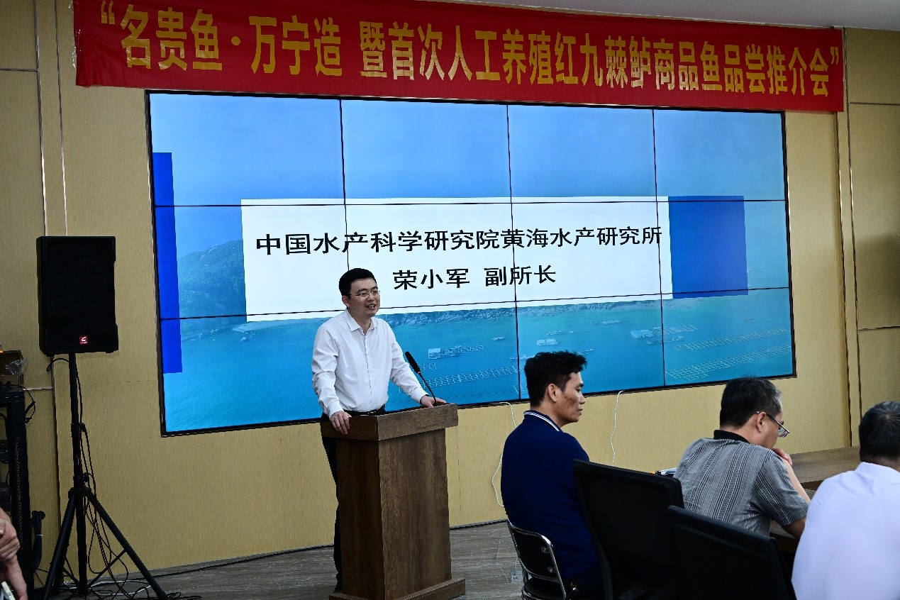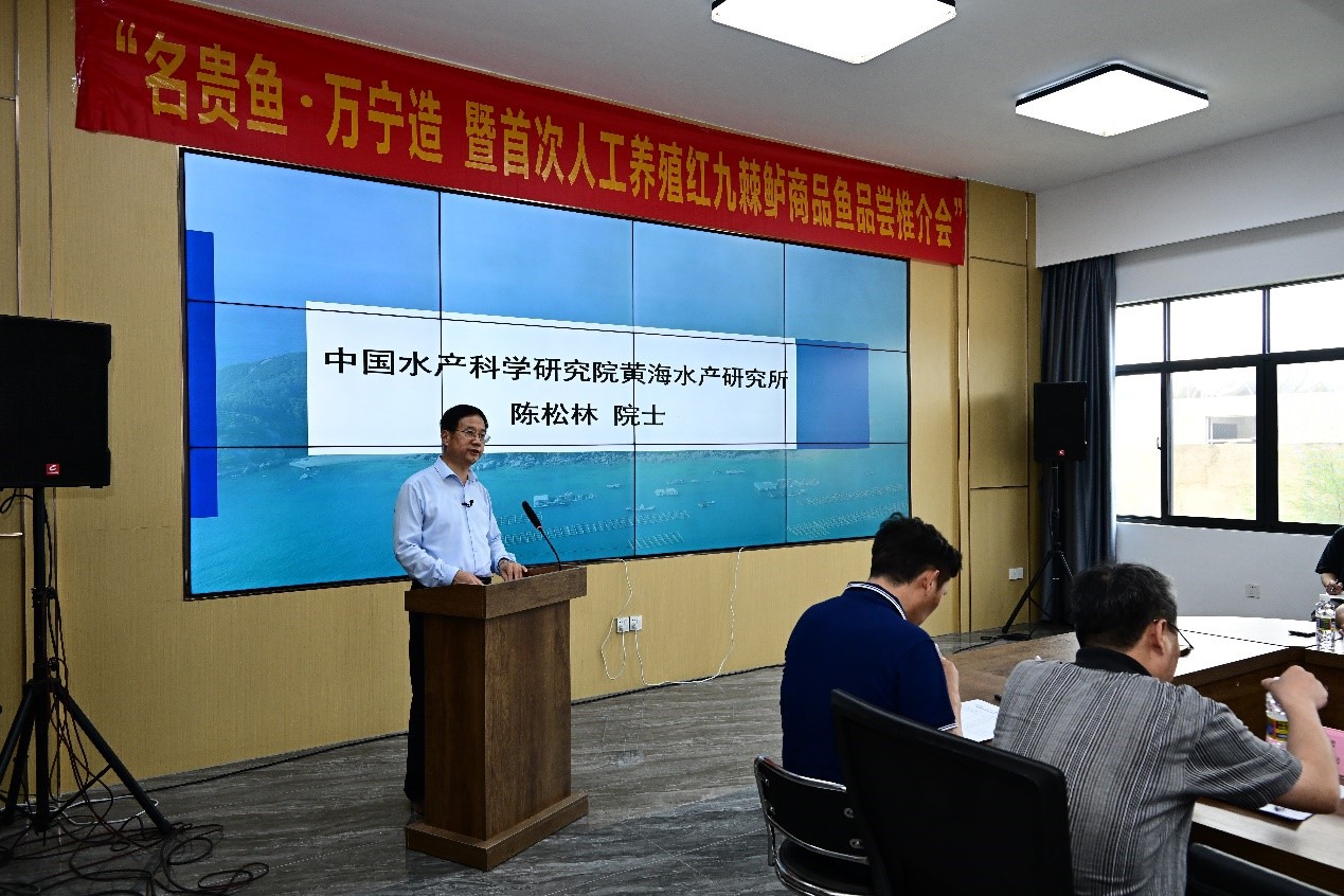 4月8日,中国水产科学研究院黄海水产研究所牵头组织的“名贵鱼?万宁造 暨首次人工养殖红九棘鲈商品鱼品尝推介会”在海南万宁林兰水产养殖有限公司召开。中国工程院院士陈松林,黄海水产研究所副所长荣小军,海南省农业农村厅厅长何琼妹,海南省科学技术厅副厅长蒙巍,万宁市市长王三防以及海南省海洋渔业科学院、海南大学和海南热带海洋学院等单位的有关专家出席了推介会。