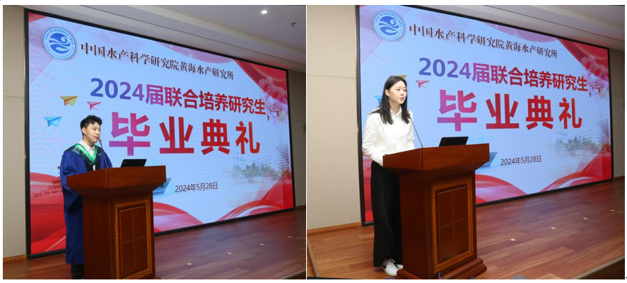 黄海所研究生会主席罗梓峻同学作为毕业生代表讲述了自己在黄海所求学与科研的过往点滴,表示将始终不忘导师们的殷切期望和深情嘱托,不断砥砺前行,为我国海洋渔业科研事业贡献力量。2023级研究生新生代表王筱向毕业生送上诚挚的祝福,并表示新生们将以师兄师姐们为榜样,继续秉承严谨求实的科研精神以及积极向上的生活态度,更好规划自己的研究生生活,为未来发展打下坚实基础。