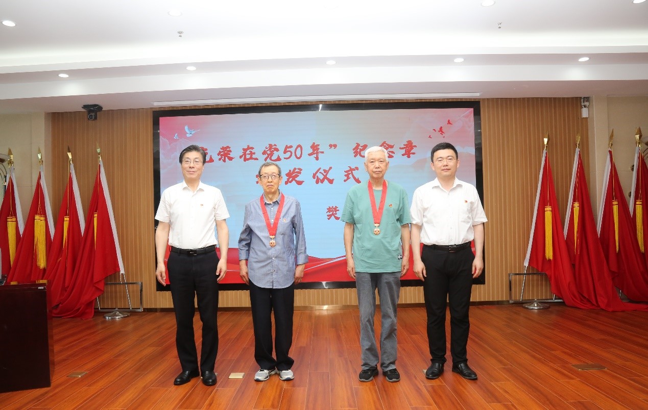 赵宪勇书记、荣小军副所长为我所党龄达到50周年的老党员俞世山、樊长云颁发了“光荣在党50年”纪念章。自2021年以来,我所已为44名符合要求的老党员颁发纪念章。