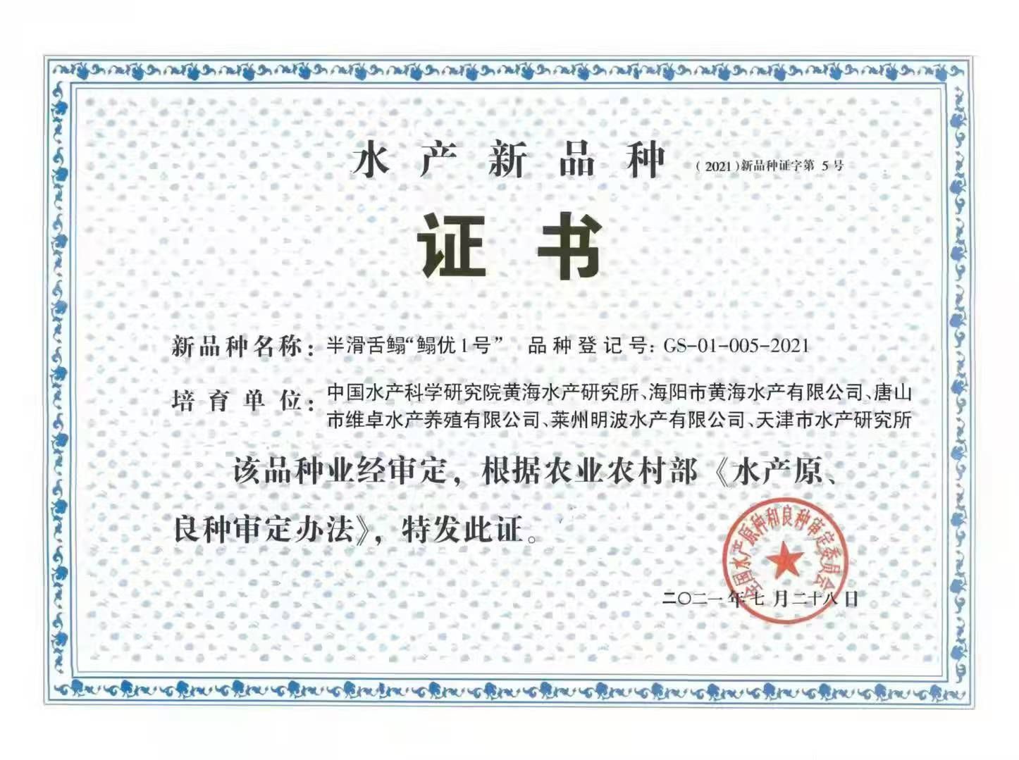 半滑舌?!镑S?号”新品种由黄海所联合海阳市黄海水产有限公司、唐山市维卓水产养殖有限公司和莱州明波水产有限公司等国内多家半滑舌鳎养殖企业历经十余年培育而成?!镑S?号”新品种具有抗病力强、生长快、养殖存活率高等优点,与未经选育的半滑舌鳎相比,抗哈维氏弧菌感染能力提高30.9%,18月龄鱼的体重平均提高17.7%,养殖成活率平均提高15.7%。此外,“鳎优1号”新品种苗种的生理雌鱼比例比普通苗种提高了20%左右。