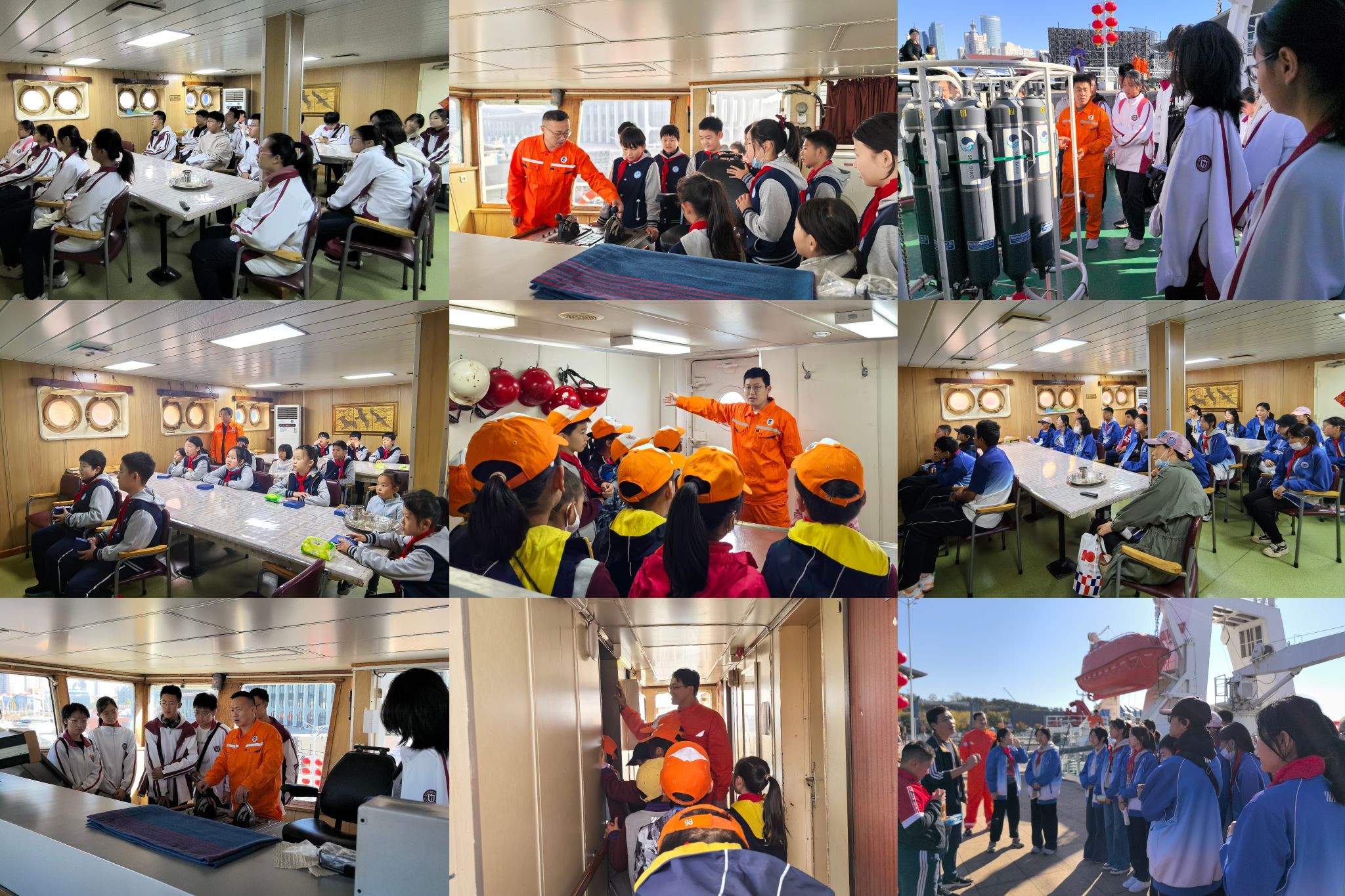 学生及家长们在工作人员带领下有序参观了驾驶室、声学仪器室、船载实验室、生活区及甲板等区域,并观看了“‘功勋北斗’40周年”宣传片。船员们为大家分区域进行了专业科普讲解,展示了科考船导航仪器、雷达、电子海图以及各类船载仪器设备等使用和操作方法,带领同学们亲身体验了科考船上的工作日常以及科研人员如何在海上“移动实验室”进行科研工作。