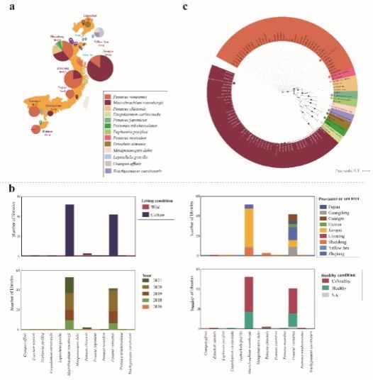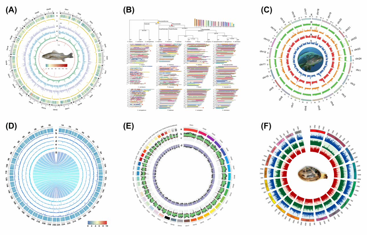 海水鱼类基因组学及分子育种技术创新团队、海洋渔业生物遗传资源评价与合成利用创新团队、海水贝类种质创制与利用创新团队、海水池塘生态工程化养殖创新团队、渔业资源分子生态学团队等研究利用ONT ultra-long、PacBio HiFi和Hi-C测序数据,绘制了我国首个海水鱼类(花鲈)以及鞍带石斑鱼、红九棘鲈和星突江鲽端粒到端粒(T2T)的高质量参考基因组,绘制了脊尾白虾、菲律宾蛤仔和七星底灯鱼染色体水平的基因组;发现了鲽形目鱼类共享性染色体祖先核型,精确鉴定了星突江鲽性染色体和性别决定候选基因gsdf;解析了脊尾白虾盐碱胁迫适应机制;阐释了滩涂贝类适应埋栖生活的形态进化和分子机理;构建的首个染色体水平的灯笼鱼基因组,为黄东海域七星底灯鱼隐存种的存在提供了生态基因组学证据,阐明了七星底灯鱼适应昼夜垂直移动的遗传基础。研究成果发表在Scientific Data、Zoological Research、Biology-Basel等刊物上。