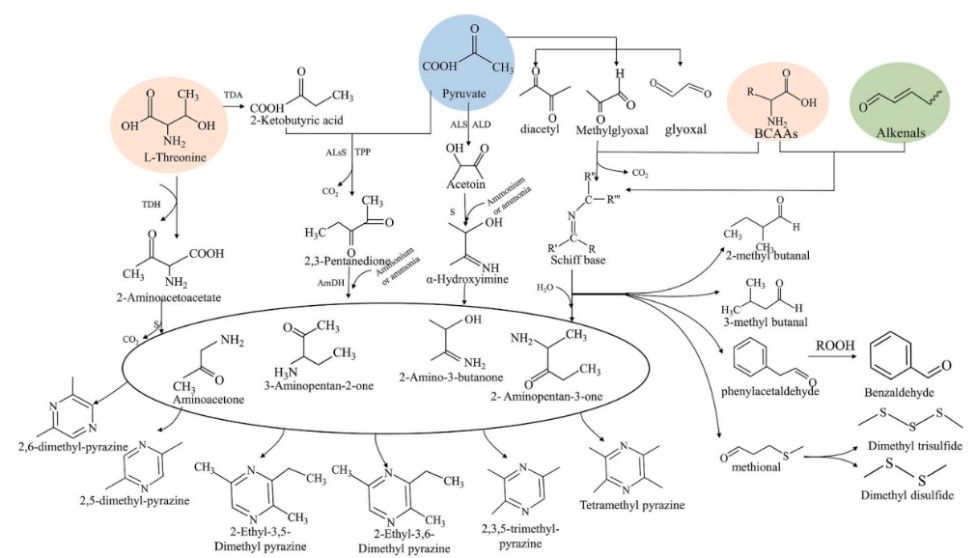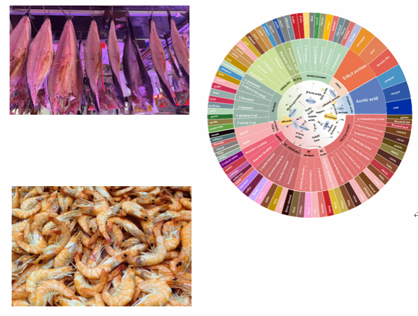 典型干制水产品风味轮廓(右上)与关键风味物质代谢途径