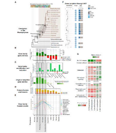研究团队构建了涵盖褐藻门主要类群的基因组数据库,有效填补了多种褐藻基因组数据空白。通过对基因组数据的深入解析,研究团队发现新直系同源基因家族的获得、蛋白质结构域重排、水平基因转移事件,以及一系列与生存和适应密切相关的代谢途径的演化共同驱动了褐藻谱系的发生与分化,揭示了褐藻中海藻酸、卤素和多酚等代谢途径对褐藻适应性特征的塑造作用,阐释了褐藻基因组多样性与生活周期策略和配子鞭毛结构等诸多表型特征多样性分化之间的紧密联系?;坪K哦痈涸鹌渲械乃交蜃剖录治龉ぷ?。