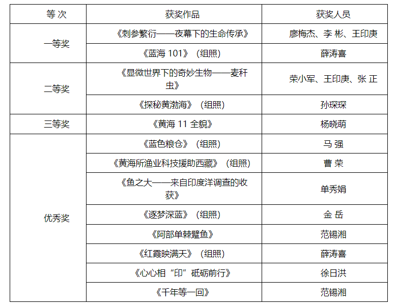 中国水产科学研究院黄海水产研究所认真对待、精心安排,组织全所干部职工积极响应、踊跃投稿,推荐的作品中有13幅作品分获一、二、三等奖和优秀奖,黄海所获优秀组织奖。
